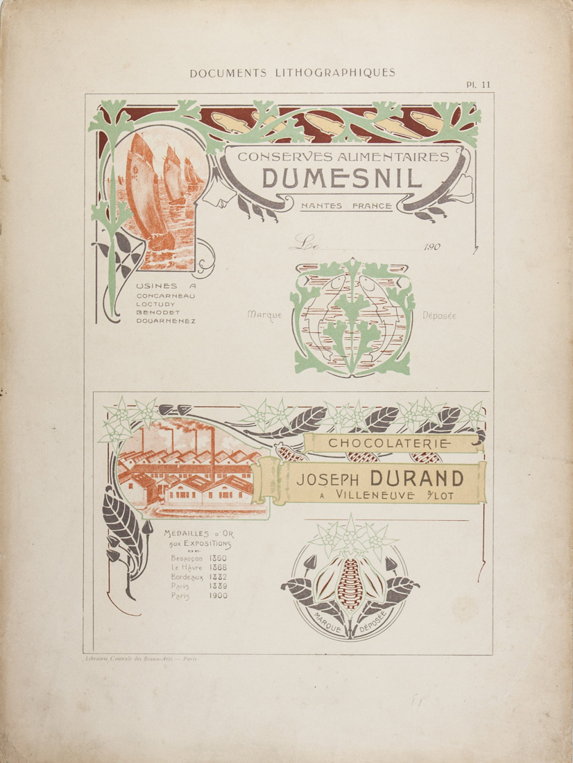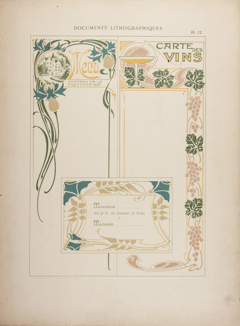 Litografia a colori. mm 200x270. Foglio: mm 285x380. Tav. n. 2 da Documents lithographiques. Quarante planches comportant plus de 300 Compositions originales en couleurs de MM. H. Bellery Desfontaines, M. Orazi, M. P. Verneuil, M. Fraikin, Riom, F. Laskoff, Paris, Librairie Centrale des Beaux Arts, s. d. (1900 ca.). Si aggiungono 9 tavv. di altri autori (n.1, 3-6, 8-9,11-12). (10)