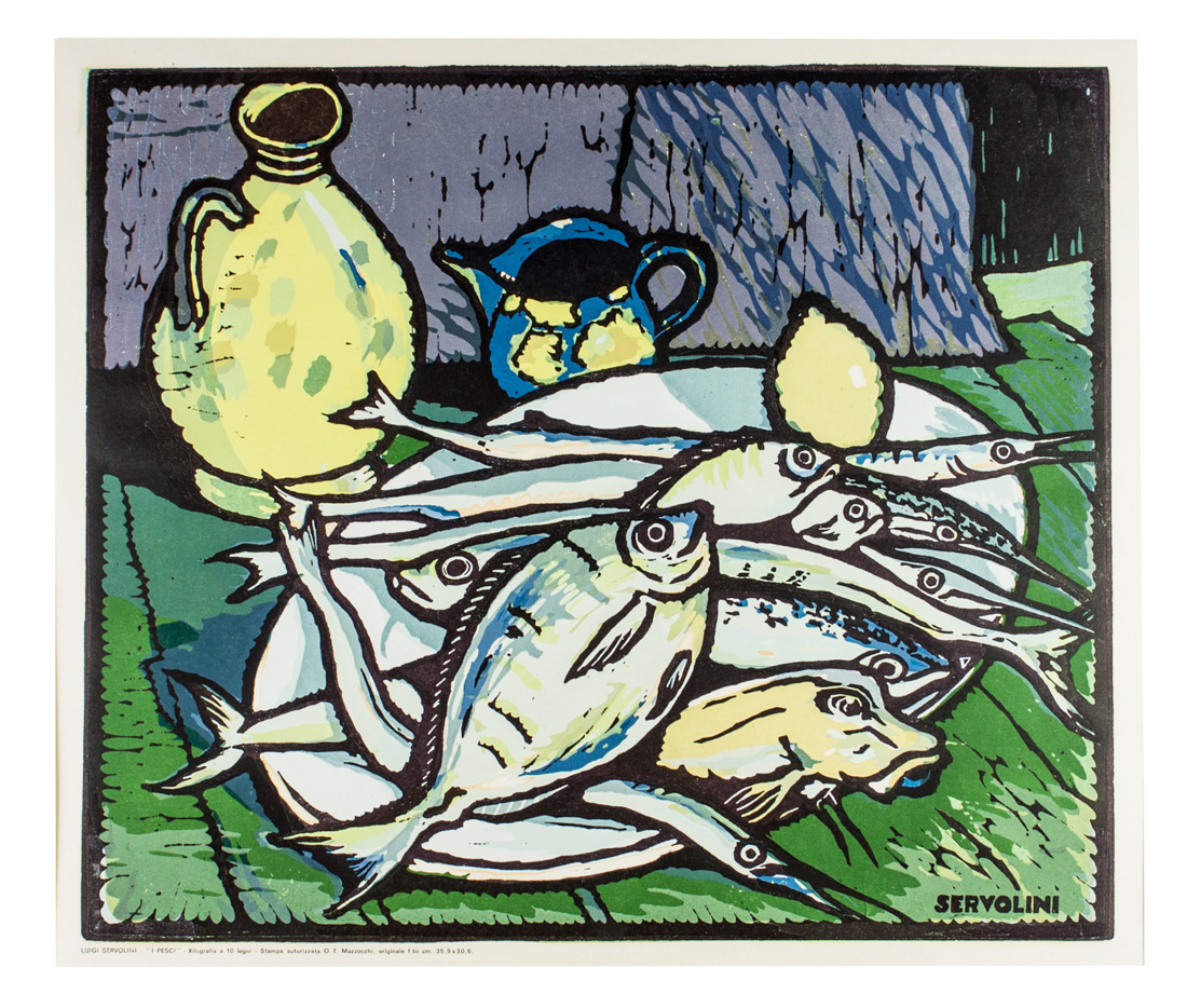 Luigi Servolini I pesci.1935Xilografia a 10 legni. mm 290x345. Foglio: mm...