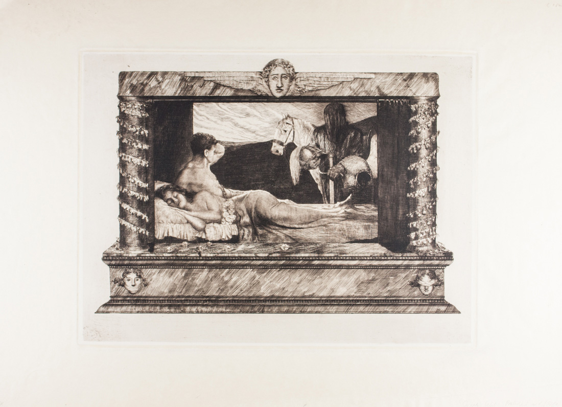 Puntasecca e acquaforte. mm 300x400. Foglio: mm 420x570. incubi nordici p. 125. Annotata a matita in basso a destra: "Joseph Uhl Probedruck...". Tavola 9 dal ciclo "Ein Liebesmysterium (Un mistero d'amore)", 1913.