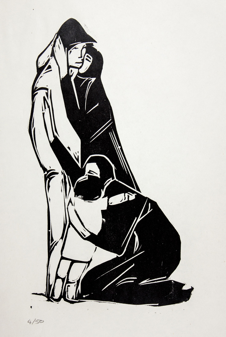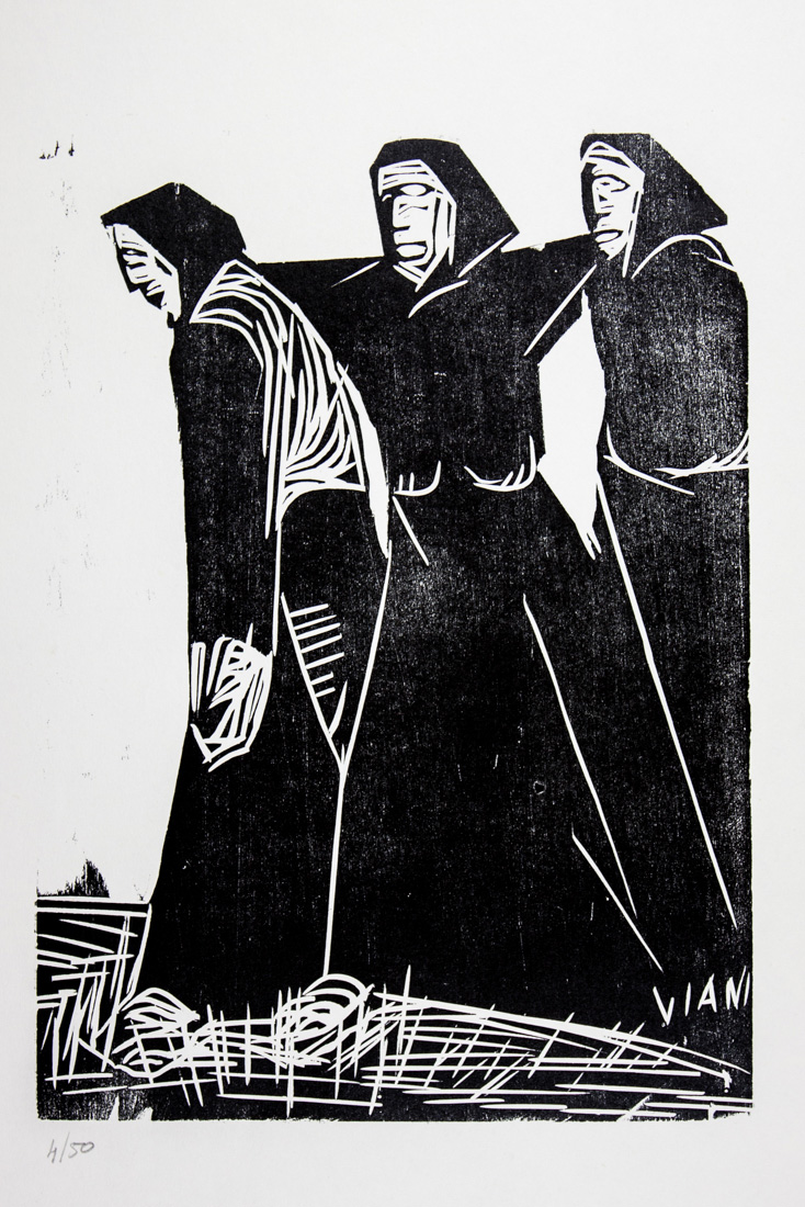 Cartella edit. mm 505x355, contenente 8 xilografie originali di Lorenzo Viani: La disgrazia, L'attesa, Vedova di marinaio, Le vedove, Cercatrici di legna, Le comari, Il reduce, Il riposo. Ognuna numerata a matita 4/50 e con al retro certificato di garanzia. Edita in occasione della mostra "Viani intimo", 28 agosto-18 settembre 1961.