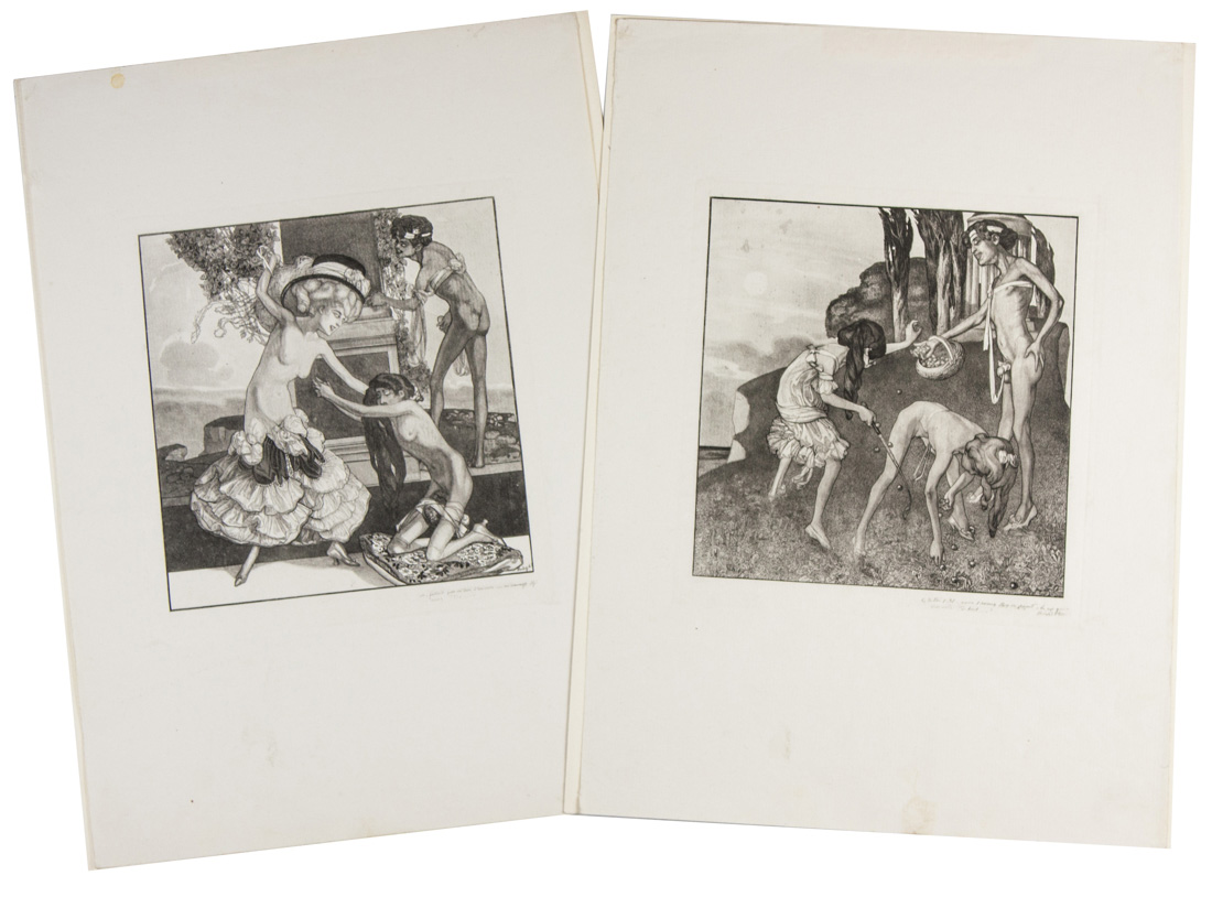 1) acquaforte e acquatinta. mm 235x225. Foglio: mm 335x295. Firmata sulla lastra in basso a destra. Dalla serie Die Bonbonnière galante und artige sammlung erotischer phantasein..., edita nel 1907 a Vienna in 530 esemplari numerati da C.W. Stern e stampata da G. Röttig & Sohn. 2) e 3): fotoincisioni. mm 185x175. Fogli: mm 350x250 cad. dalla serie Bilder aus dem Boudoir der Madame C.C., stampata privatamente nel 1912.(3)