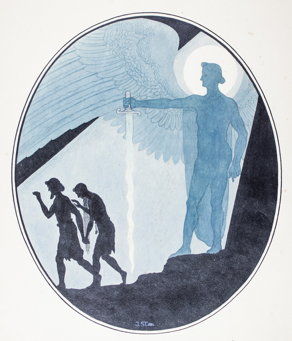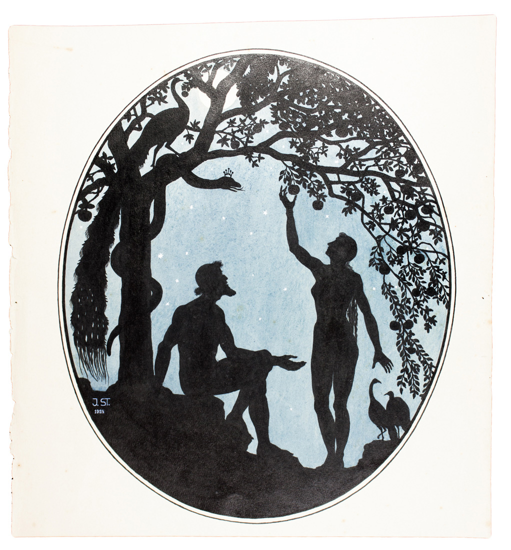 Due disegni a silhouette in ovale eseguiti a china e acquerello su cartoncino. Fogli: mm 330x285 cad. Siglati e datati "J. St. 1924". (2)