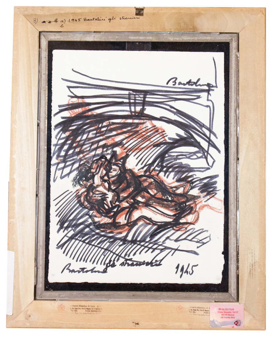 Inchiostro e pastello su carta. mm 350x260. Titolato e firmato. Al verso: Gli stranieri. Inchiostro e pastello su carta. Firmato, titolato e datato.