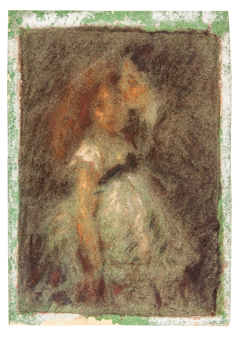 Pastelli colorati su base a tempera su cartoncino. mm 170x120. Questo piccolo studio o schizzo evanescente è legato al famoso dipinto Il bacio o I due cugini del 1870 (Roma, Galleria Nazionale d'Arte Moderna) opera con la quale l'artista approdò a quella nuova maniera che caratterizza le sue opere mature scapigliate, sperimentate insieme a Daniele Ranzoni, nelle quali sfalda i contorni e sfuma i toni del colore.