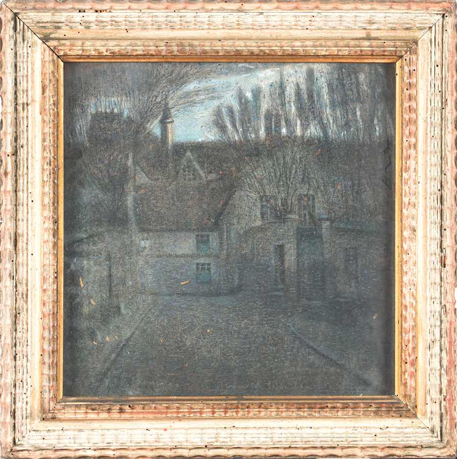 Pastello su carta incollata su cartone. mm 380x380. Firmato in basso a sinistra "R.D.M. Ferenzona, Paris 1906". Titolato in basso a destra "Il primo sole bacia il convento addormentato". Al verso della cornice cartellino d'esposizione "MEZZO SECOLO D'ARTE TOSCANA, SOCIETA' DELLE BELLE ARTI PALAZZO STROZZI FIRENZE N. 531".