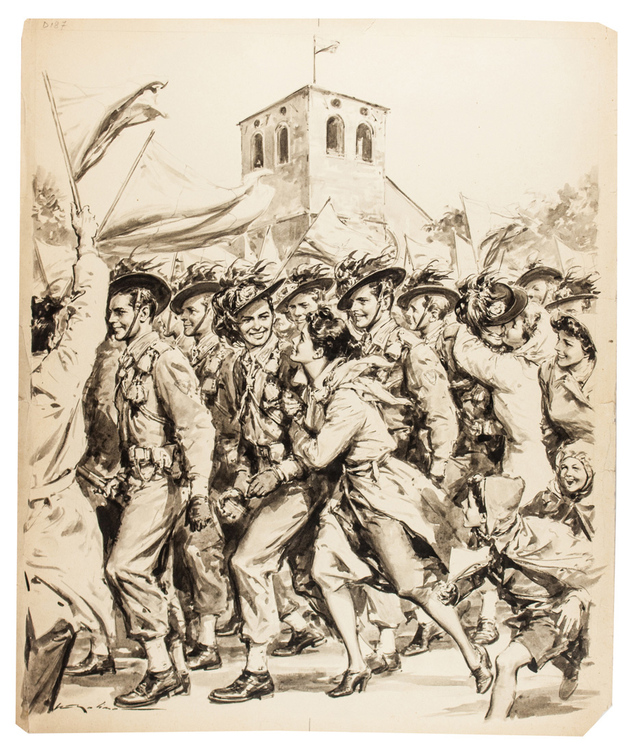 1954Penna e inchiostro nero su cartoncino avorio. mm 425x355. Firmato in basso a sinistra. Disegno originale per la copertina de "La Domenica del Corriere", n. 45, 1954. Al retro incollato ritaglio con il titolo a stampa: "1918-1954. Il secondo trionfale ingresso dei bersaglieri a Trieste".