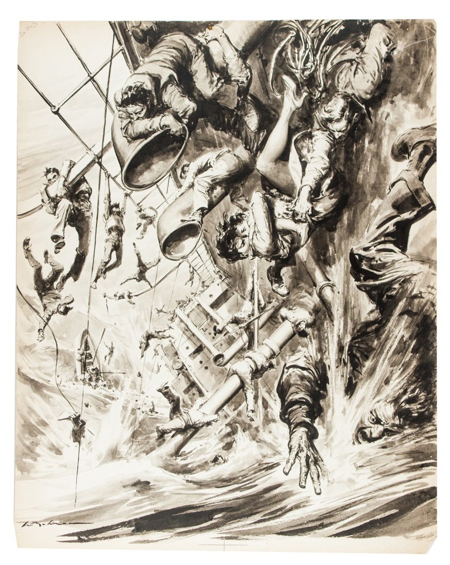 Penna e inchiostro nero acqurellato su cartoncino avorio. mm 435x345. Firmato in basso a sinistra. Disegno originale per copertina de "La Domenica del corriere", n. 41, 1954. Al retro incollata la didascalia a stampa: "Tragico uragano in Giappone. Lo scatenarsi improvviso di un violentissimo tifone sulle isole nipponiche...".