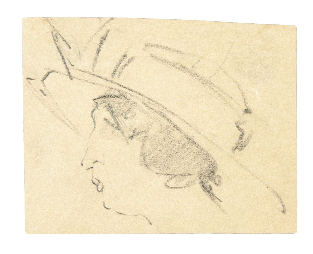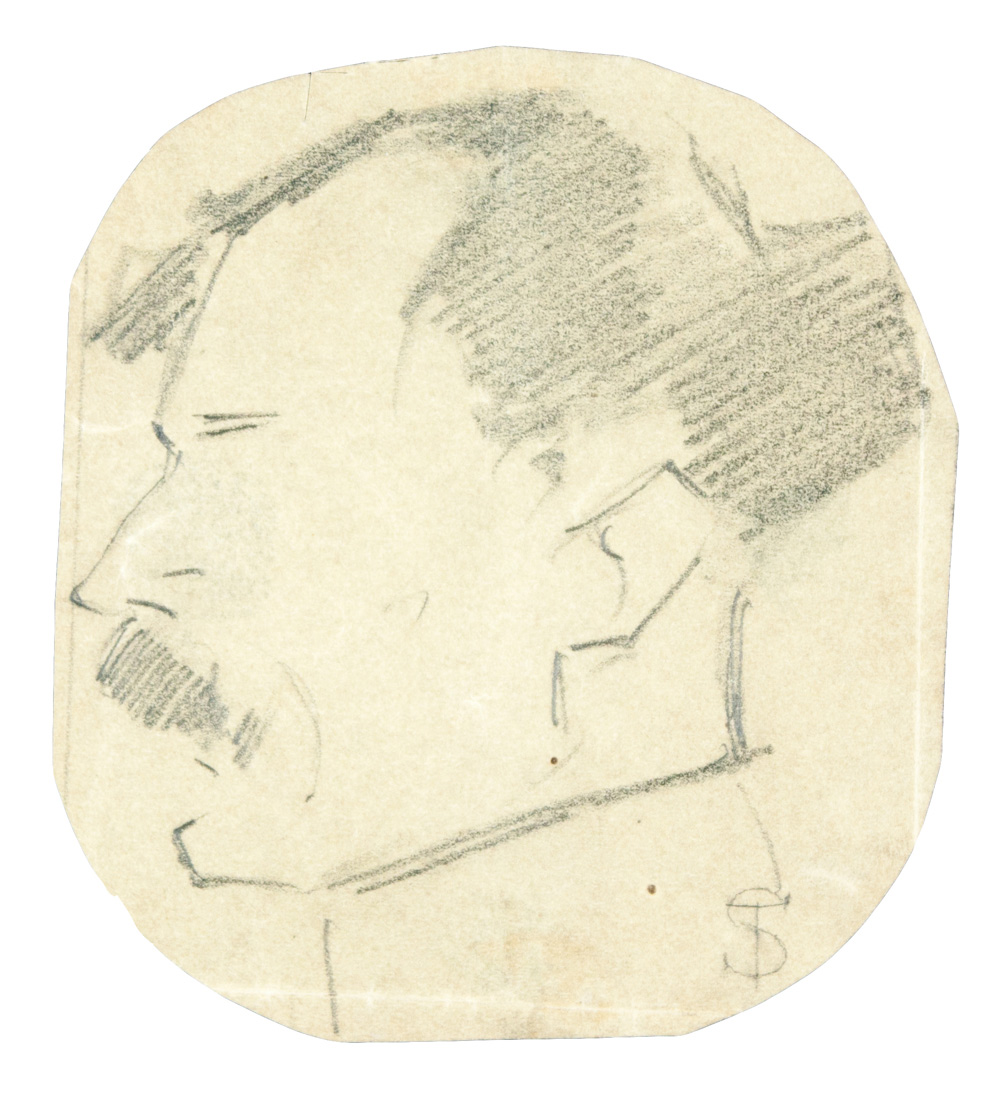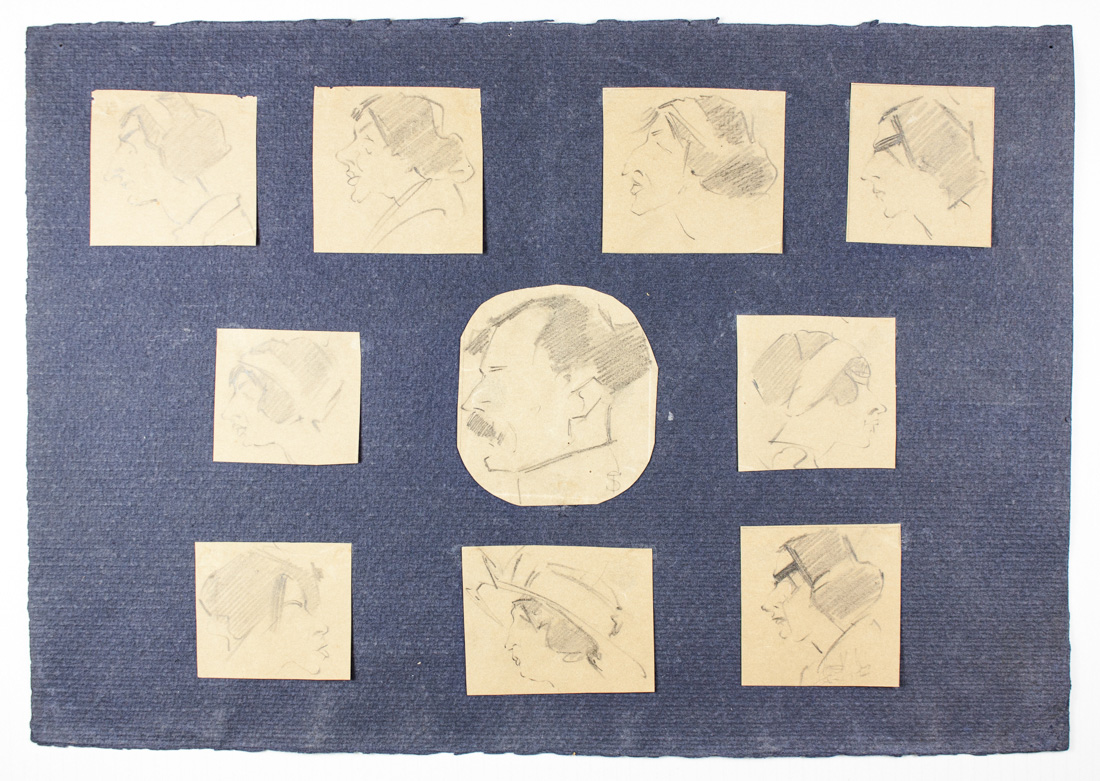 Matita nera su carta, 10 disegni di misure varie (mm 70x80 ca. cad.). Firmato con le iniziali a matita in basso a destra il foglio della caricatura centrale. Montate a serie su un unico cartoncino nero. (10)