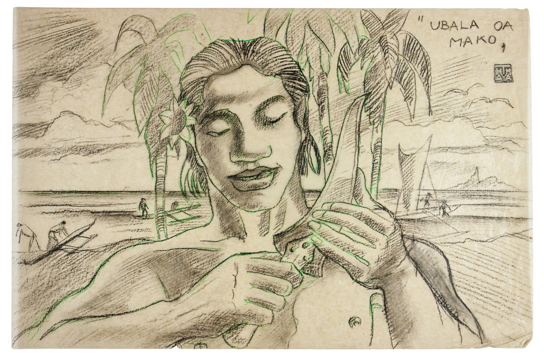 Matita nera e verde su carta da lucido. mm 240x370. Titolo a matita in alto a destra con sotto il timbro "Thayat". Dopo il 1945 Thayaht si orienta nei suoi temi verso le figure tahitiane di Paul Gauguin, che riscopre come "grande colorista" e come pittore simbolico alla ricerca di una vita semplice alle origini del mondo realizzando trasformazioni thayahtiane delle sue opere, come "liberazione dalla miserabile civilizzazione". Lui stesso volle riunire questo tipo di opere in una mostra a Forte dei Marmi nel 1950 dal titolo Omaggio a Gauguin. Una sorta di "ritorno all'indietro": dal Futurismo a Gauguin.