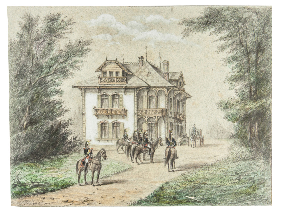 Horace Vernet Paesaggio con villa e soldati a cavallo. Matita di grafite e...