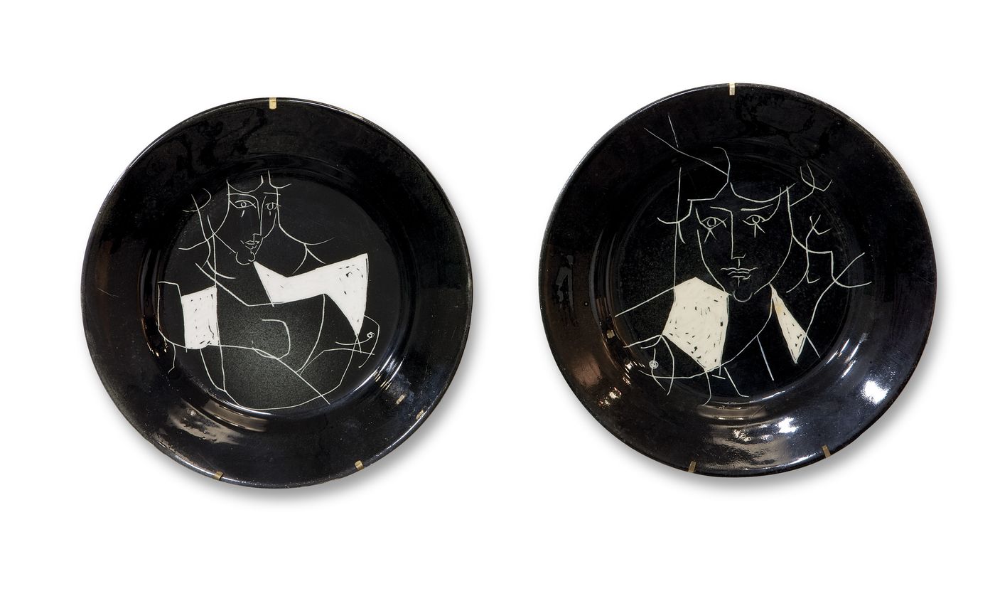 GARELLI Due piatti smaltati in nero con decoro graffito a figure femminili. Inciso al retro della tesa Garelli 15 8 53 Albisola. diam cm 19,5 Bibl.: Esemplare confrontabile per la tecnica del decoro in A. Mistrangelo ( a cura di) “Franco Garelli un segno del Novecento”, La Rosa editrice, 2009, pag. 45.