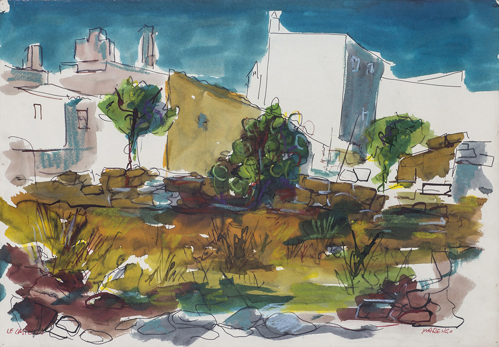 ADALBERTO MARENGO Le Castella, 1985 Tecnica mista su cartoncino Cm 34,8x50,2...