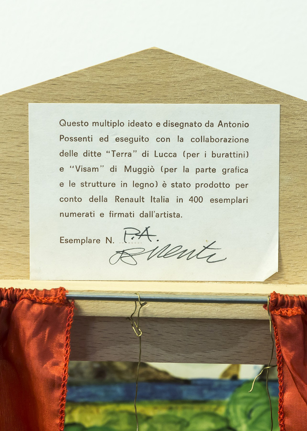 Opera realizzata dall'Artista in collaborazione con la ditta Terra di Lucca (per i burattini) e con la Visam di Muggiò (per la parte grafica e le strutture di legno) in 400 esemplari firmati e numerati per Renault Italia.