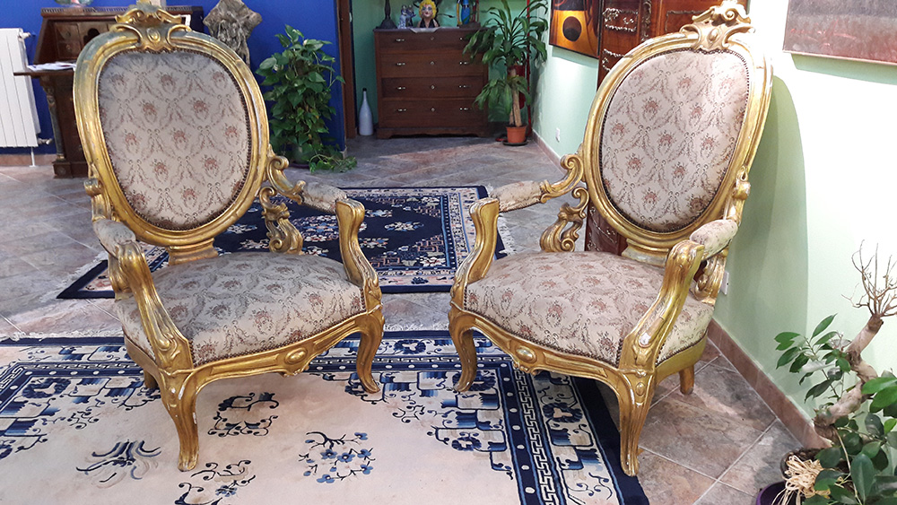 2 Importanti poltrone della seconda metà dell'800, stile Luigi Filippo, finemente intarsiate, decorate in foglia oro, cm 121x70x90 - lievi cadute di colore