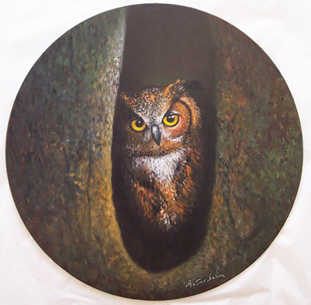 Antonio Sciacca "La civetta"- Olio su tela - diametro cm 70 - Firma dell'artista in basso a dx -Autentica su foto