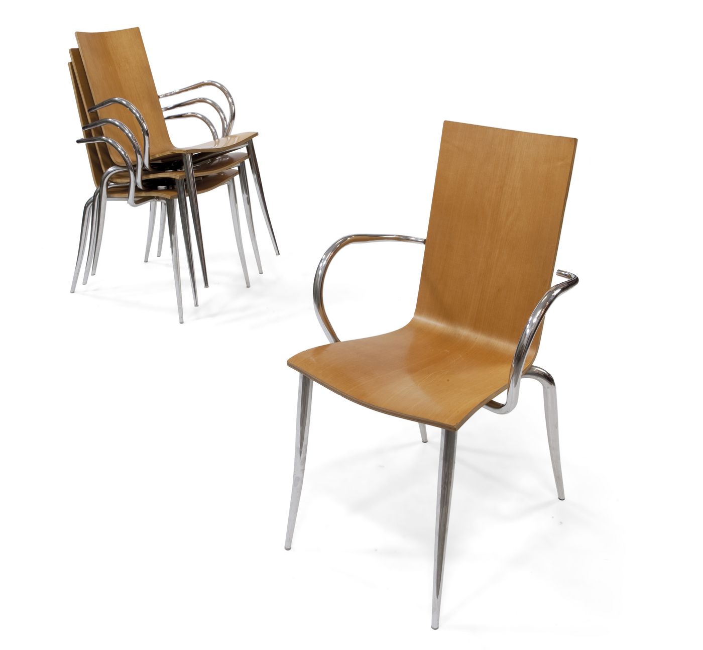 STARCK PHILIPPE Olly Tango Quattro sedie impilabili con struttura in tubolare di acciaio conificato cromato. Scocca in multistrato curvato con finitura in acero naturale. Prod.Driade 1994 cm 90x48x51 Bibl.: www.starck.com