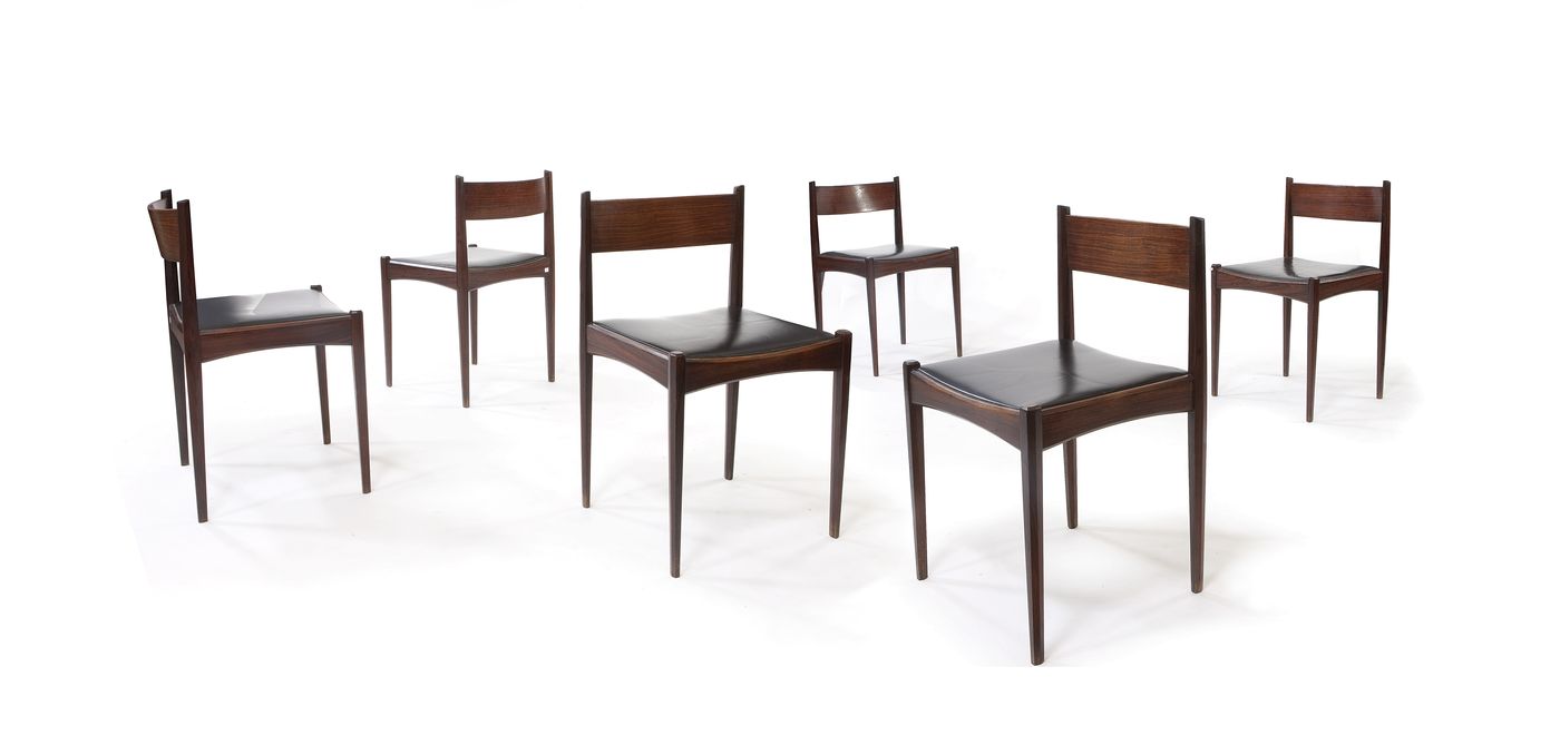 SEDIE Sei sedie in legno di palissandro rio di costruzione particolarmente raffinata con imbottitura in skai nero. cm 75x44,5x42