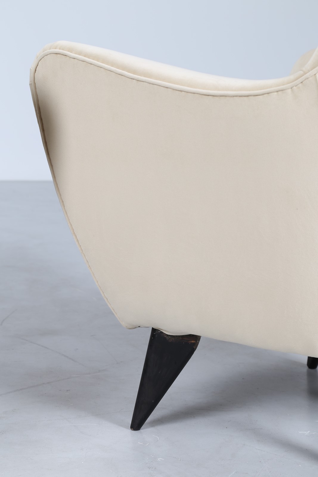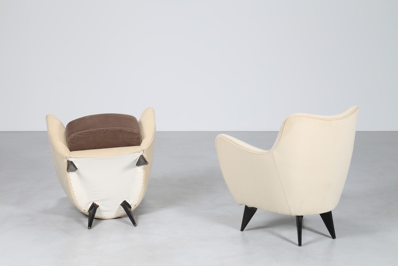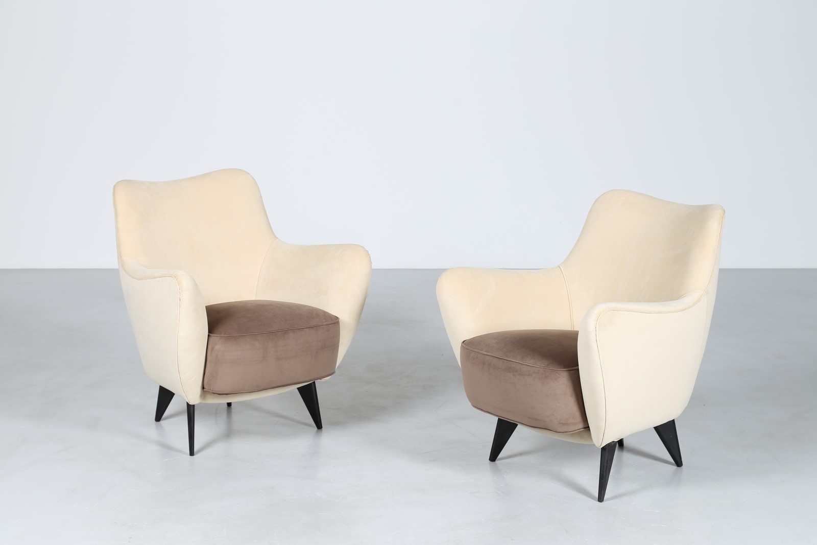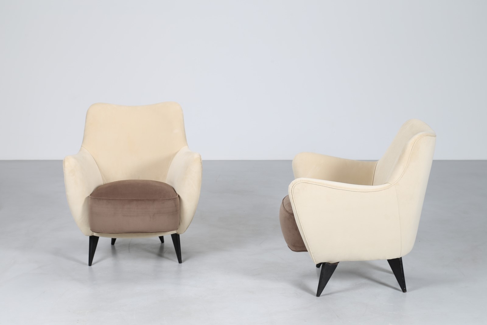 VERONESI GUGLIELMO Coppia di poltrone con struttura in legno, imbottitura rivestita in velluto. mod. Perla, per Isa anni 50. Pubblicazioni; Domus num. 247 settembre 1952 pag. 4. . -. Cm 75,50 x 86,00 x 73,00.