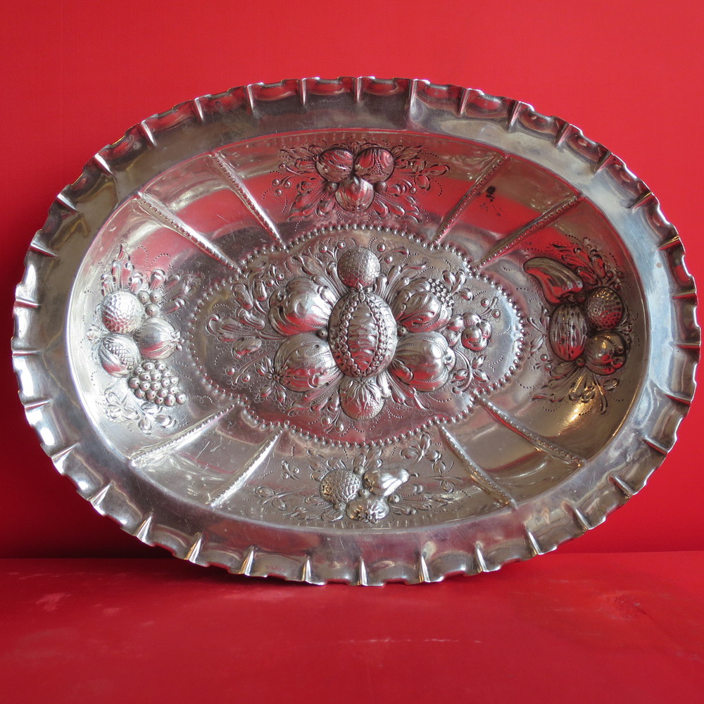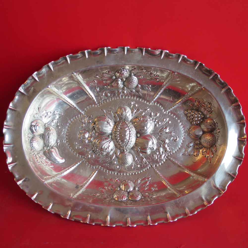 PIATTO IN ARGENTO, GERMANIA, XIX SECOLO di forma ovale con decori a sbalzo, con motivi a fiori e frutti, titolo 916/000 31 x 22 cm AN OVAL SILVER TRAY. GERMAN. 19th CENTURY