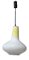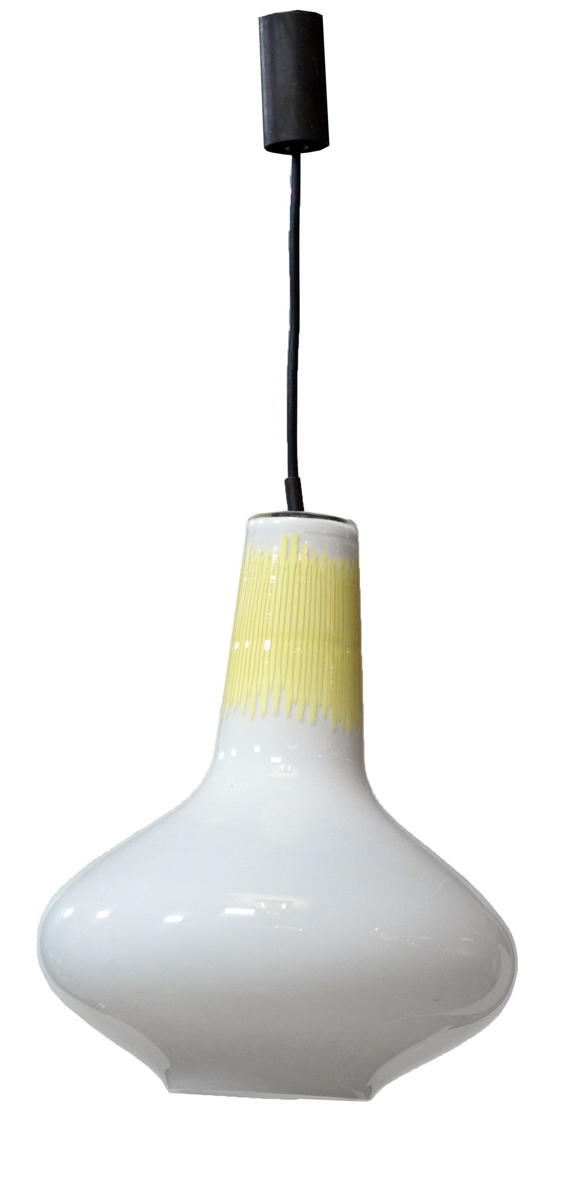 VIGNELLI MASSIMO (ATTRIBUITO A) Lampadario in vetro opalino con collo decorato a cannette a filigrana in vetro giallo. Prod. Venini 1960 diffusore h cm 35 diam cm 28