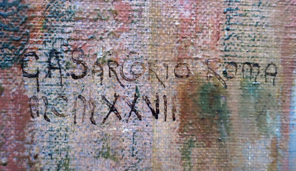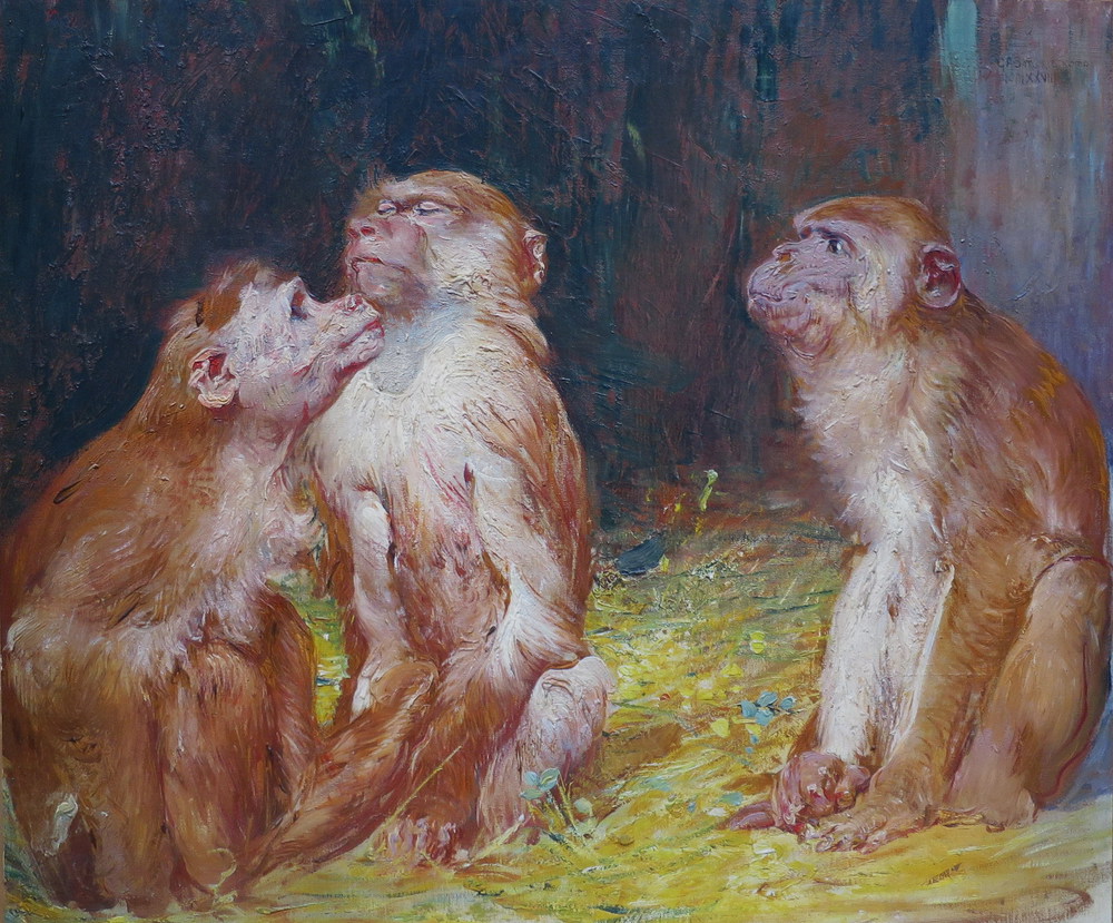 G.A. SARTORIO (1860-1932) - TRE SCIMMIE (THREE MONKEYS) Olio su tela fissato su cartone, firmato in alto a destra 74 x 62 cm Oil on canvas laid on cardboard, signed upper right 29 9/64 x 24 13/32 in.