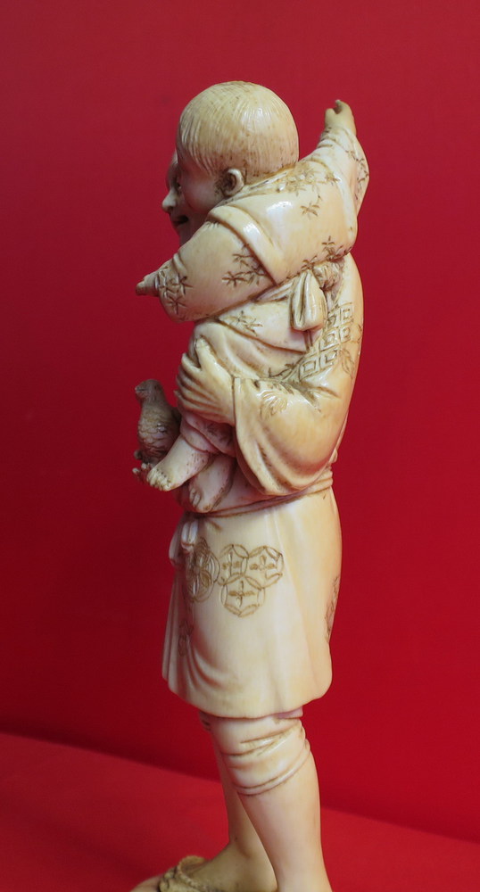 SCULTURA IN AVORIO Okimono in avorio papà con bambino e pulcino, Giappone era meiji (1868-1912) cm.16