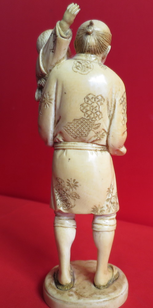 SCULTURA IN AVORIO Okimono in avorio papà con bambino e pulcino, Giappone era...
