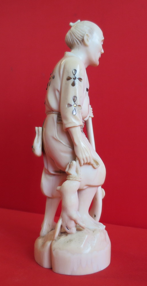 OKIMONO IN AVORIO E MADREPERLA, GIAPPONE, PERIODO MEIJI (1868-1912) con decori shibayama raffigurante cacciatore 16 cm A JAPANESE IVORY AND MOTHER-OF-PEARL OKIMONO OF A HUNTER. MEIJI PERIOD