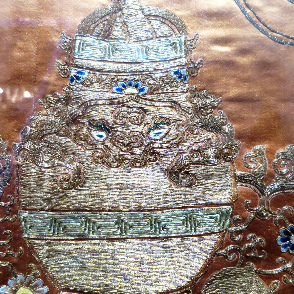 PANNELLO IN SETA, CINA, XIX SECOLO fili dorati con decori ornamentali 58 x 96 cm A CHINESE SILK EMBROIDERED PANEL. 19th CENTURY