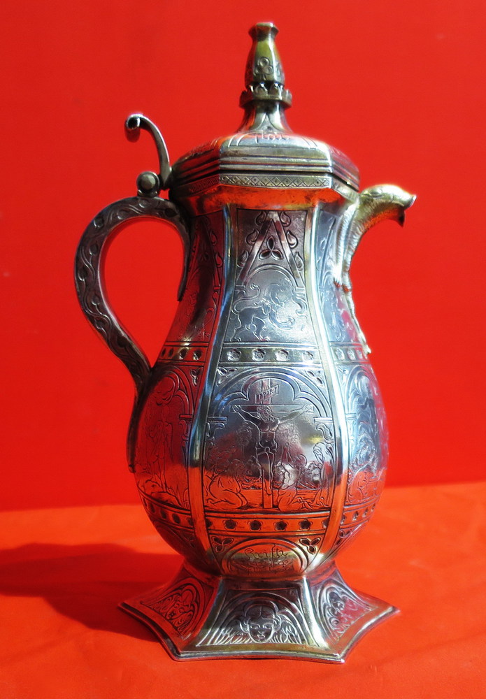 TUELS LARSEN LUND (1741 - 1779) - RARO VERSATOIO IN ARGENTO, COPENHAGEN Base a sezione esagonale gradinata con incisioni a motivo di angioletti. Parte inferiore del corpo con motivi incisi. Corpo centrale leggermente bombato con interventi finemente incisi di scene religiose; nella parte superiore simboli di centauri mitologici. Versatoio sagomato aderente al corpo a richiamo parte di arpia. Coperchio incernierato, ogni sezione con parole evocative incise, poggia dito liscio a voluta, cimasa a sezione esagonale. Impugnatura a voluta con decori a motivo di fogliato inciso. H 21 cm Peso g 436 Modello similare pubblicato sul libro "storia degli argenti" pag 57 A RARE SILVER EWER. BY TUELS LARSEN LUND. COPENHAGEN