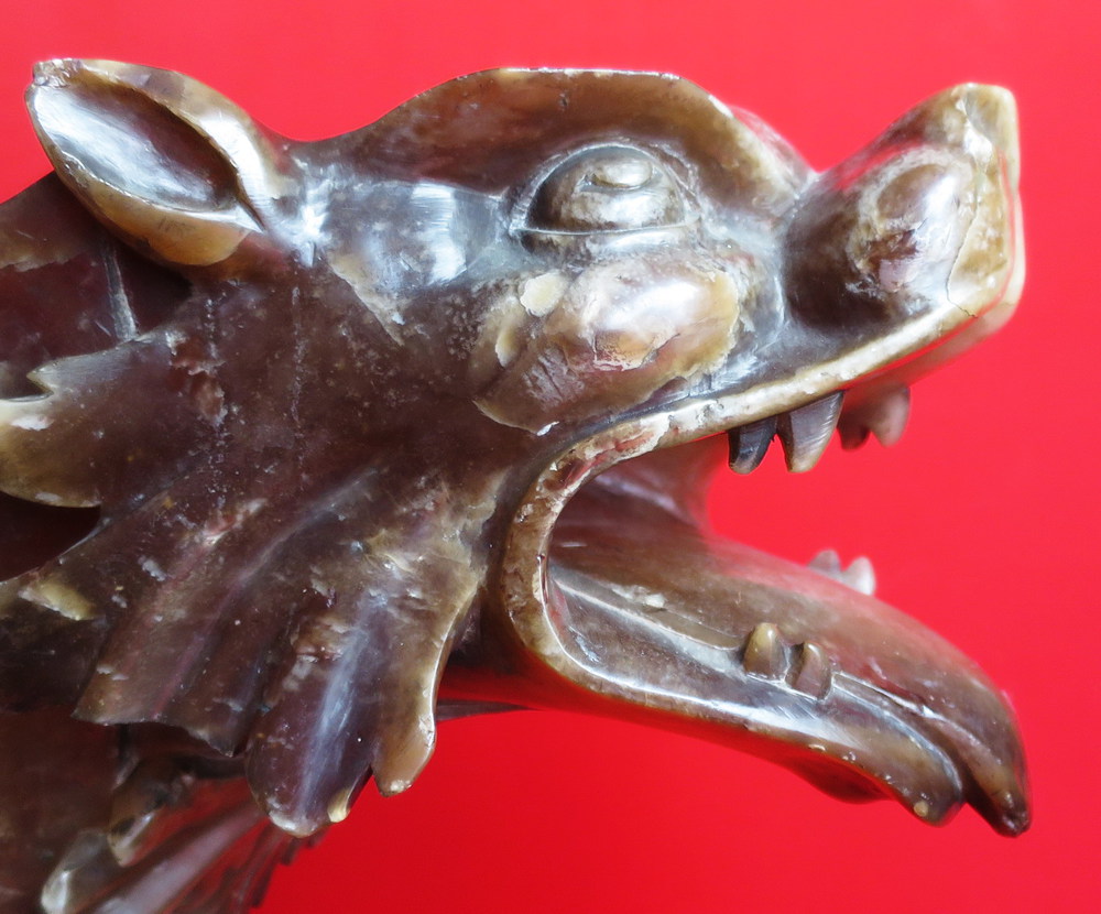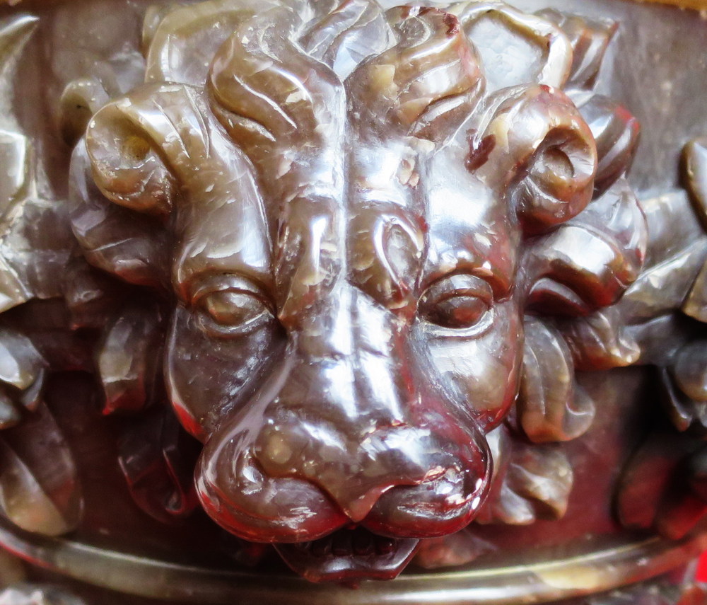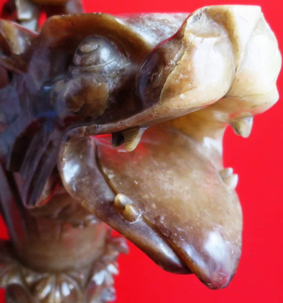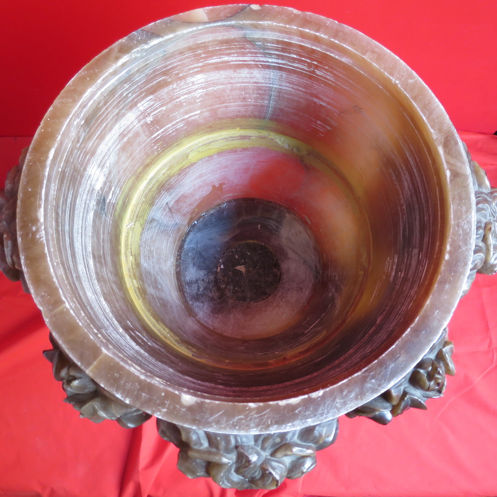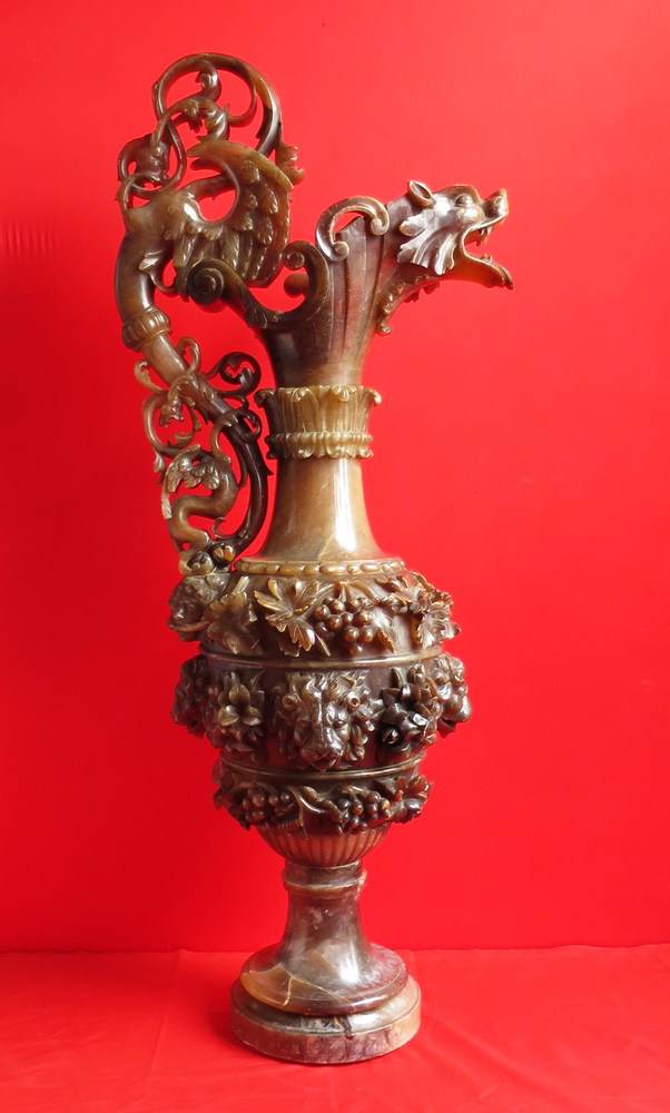 GRANDE VERSATOIO IN ALABASTRO, XIX SECOLO a due corpi con base circolare gradinata, mascheroni e tralci, parte superiore con presa scolpita a figura femminile, versatoio a testa di grifone. 123 cm A LARGE CARVED ALABASTER EWER. 19th CENTURY