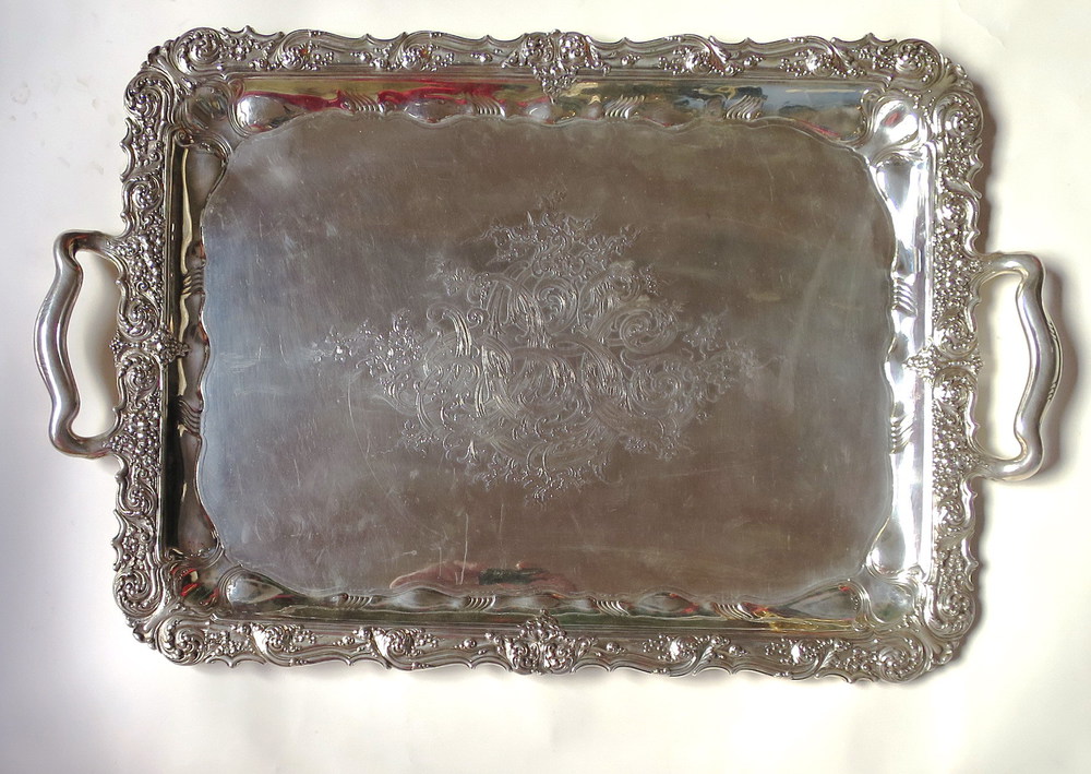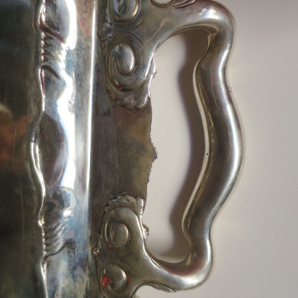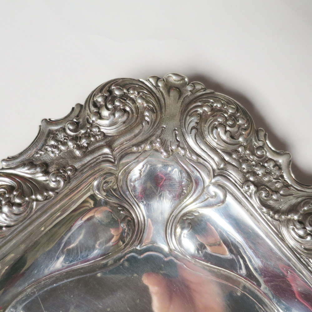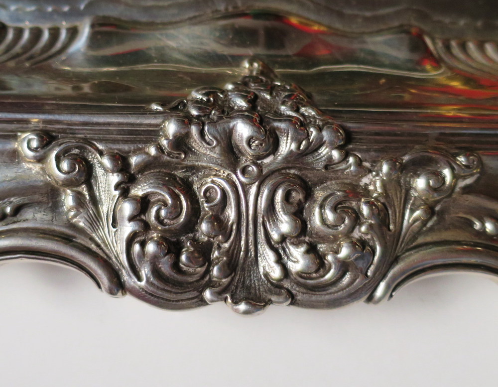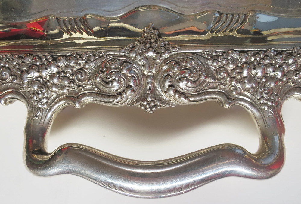 TIFFANY & CO. USA - VASSOIO IN ARGENTO, 1890 - 1910 lastra liscia con decoro centrale inciso e lavorato, bordura gradinata con decoro floreale, volute e girali. titolo sterling 925/000, 78 x 50 cm, Peso g 7500 ca. AN AMERICAN SILVER TRAY. BY TIFFANY & CO. 1890-1910