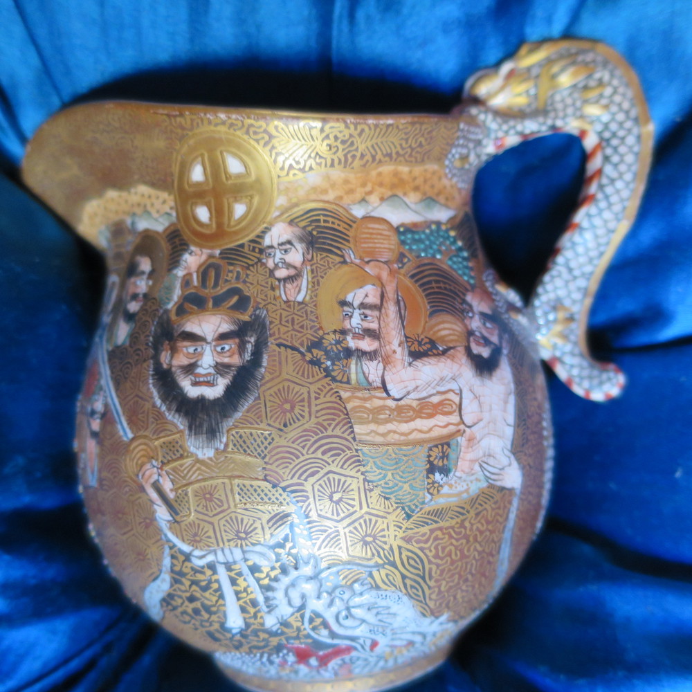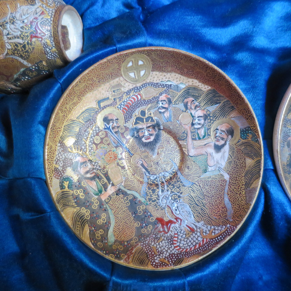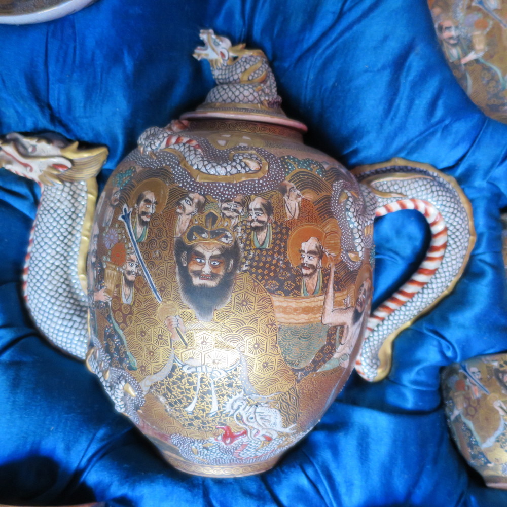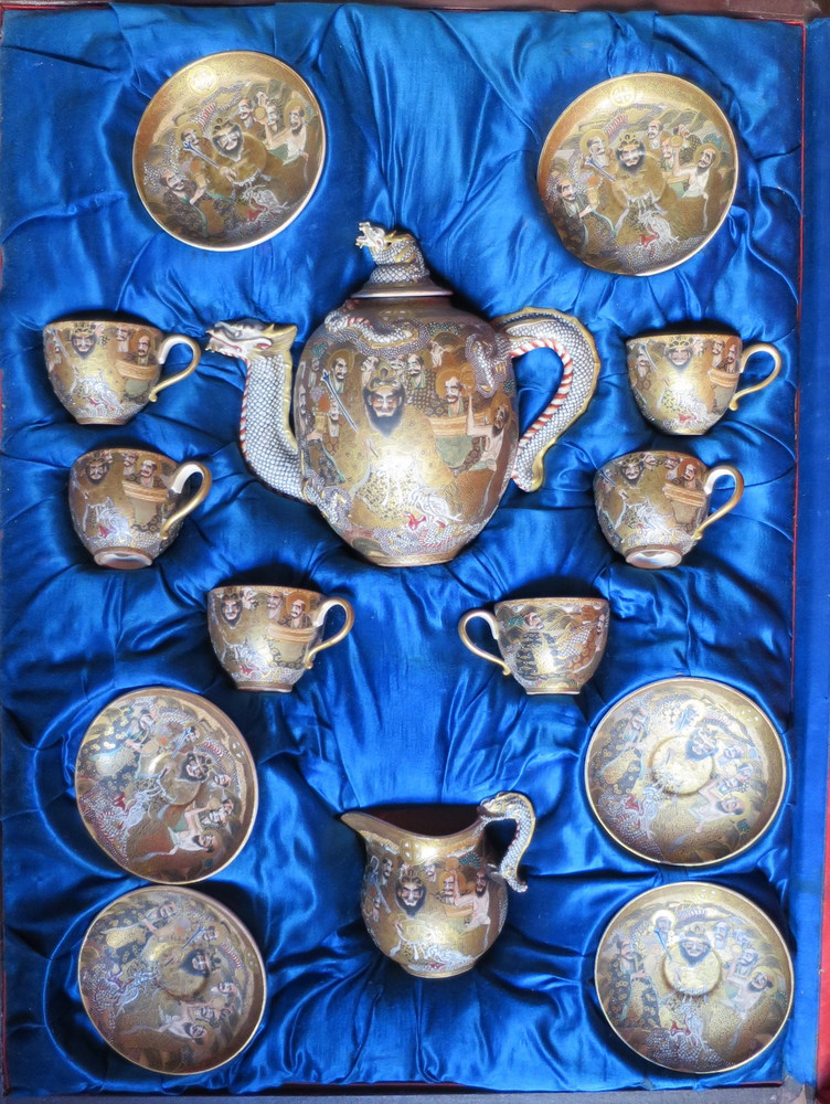 SERVIZIO DA THE' IN CERAMICA Satsuma completo di sei tazze con piattino teiera e lattiera, con scatola, Giappone era Meiji (1868-1912)