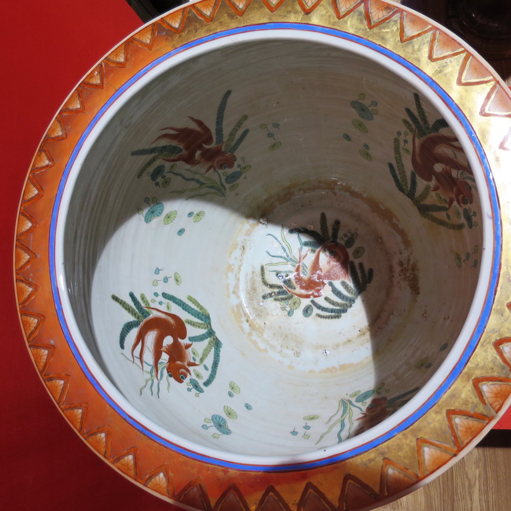 GRANDE CACHEPOT, CINA, INIZIO XX SECOLO Decorato entro riserve scena di vita quotidiana, decori ornamentali naturalistici, lumeggiature in oro, D 51,5 cm H 44 cm A LARGE CHINESE FAMILLE ROSE FISH BOWL. EARLY 20th CENTURY