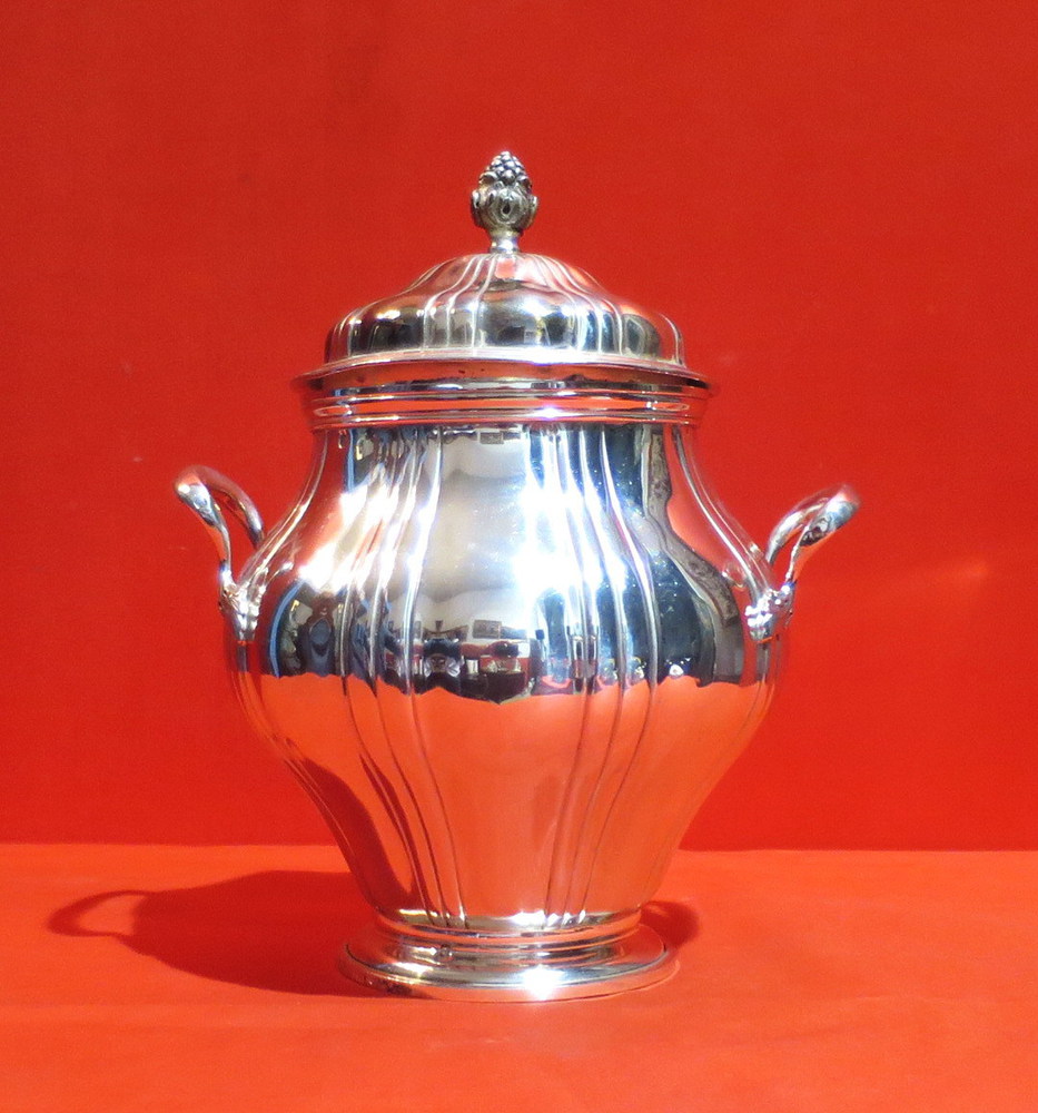 ZUCCHERIERA IN ARGENTO, FRANCIA, FINE XIX SECOLO a corpo sagomato e costolato poggiante su base circolare. coperchio con decoro ripreso dal corpo, cimasa lavorata, 16 x 20 (h) x 13 cm Peso g 573 A FRENCH SILVER COVERED SUGAR BOWL. LATE 19th CENTURY
