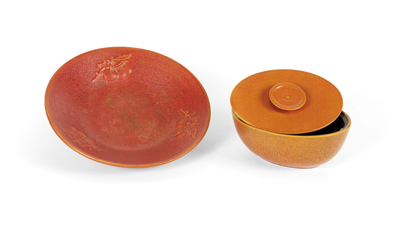 LAVENIA Lotto di due ceramiche Lavenia 1935 circa. Guido Andloviz attr. Scatola in ceramica smaltata formata a colaggio marchio: Lavenia 5-39 e 3-39 simbolo grafico. Angelo Biancini attr. Ciotola in ceramica smaltata a colaggio marchio: Lavenia e marchio delle Distillerie dell'Aurum Pescara e simbolo grafico. cm 10,5x22x17,5 diam cm 20,5