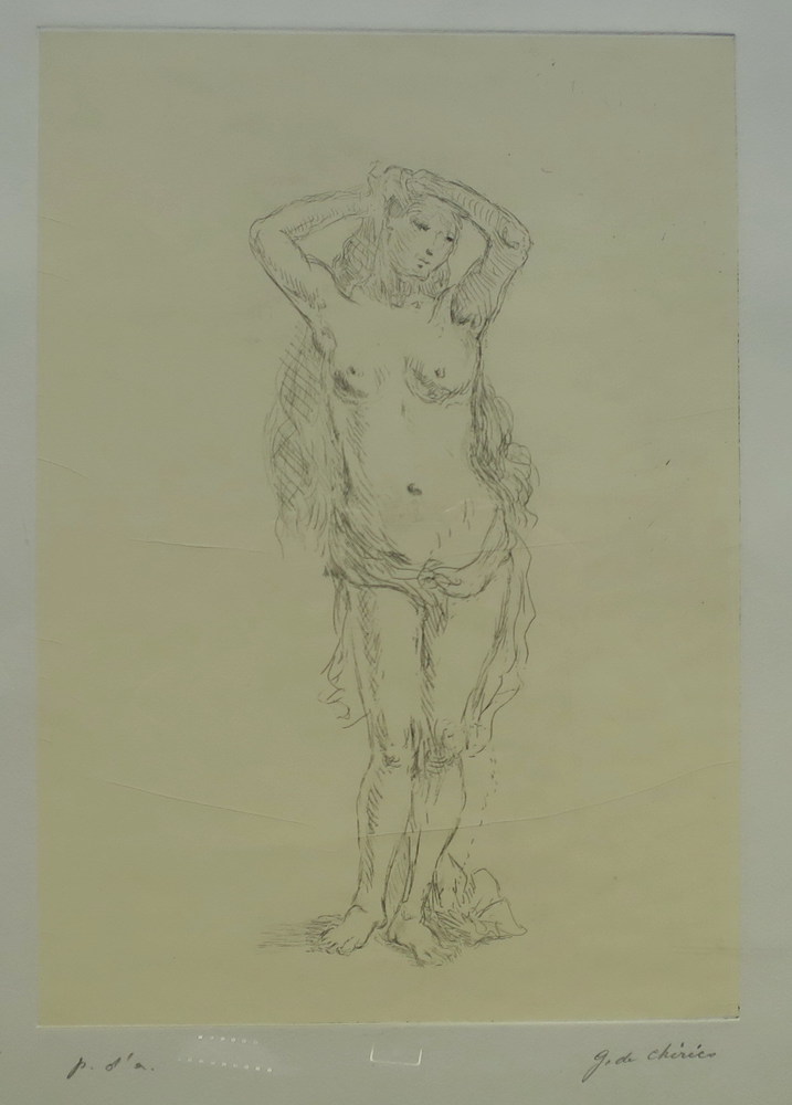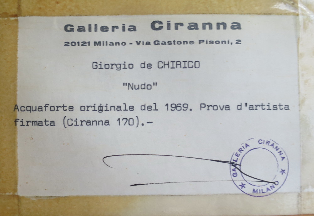 GIORGIO DE CHIRICO (1888 - 1978) - "NUDO" (NUDE FIGURE) Acquaforte P.D.A. 50 x 70 cm Firmata a matita in basso a destra Provenienza : Galleria Ciranna, Milano (etichetta al retro) Etching Artist's Proof 19 11/16 x 27 9/16 in. Signed in pencil lower right by the artist