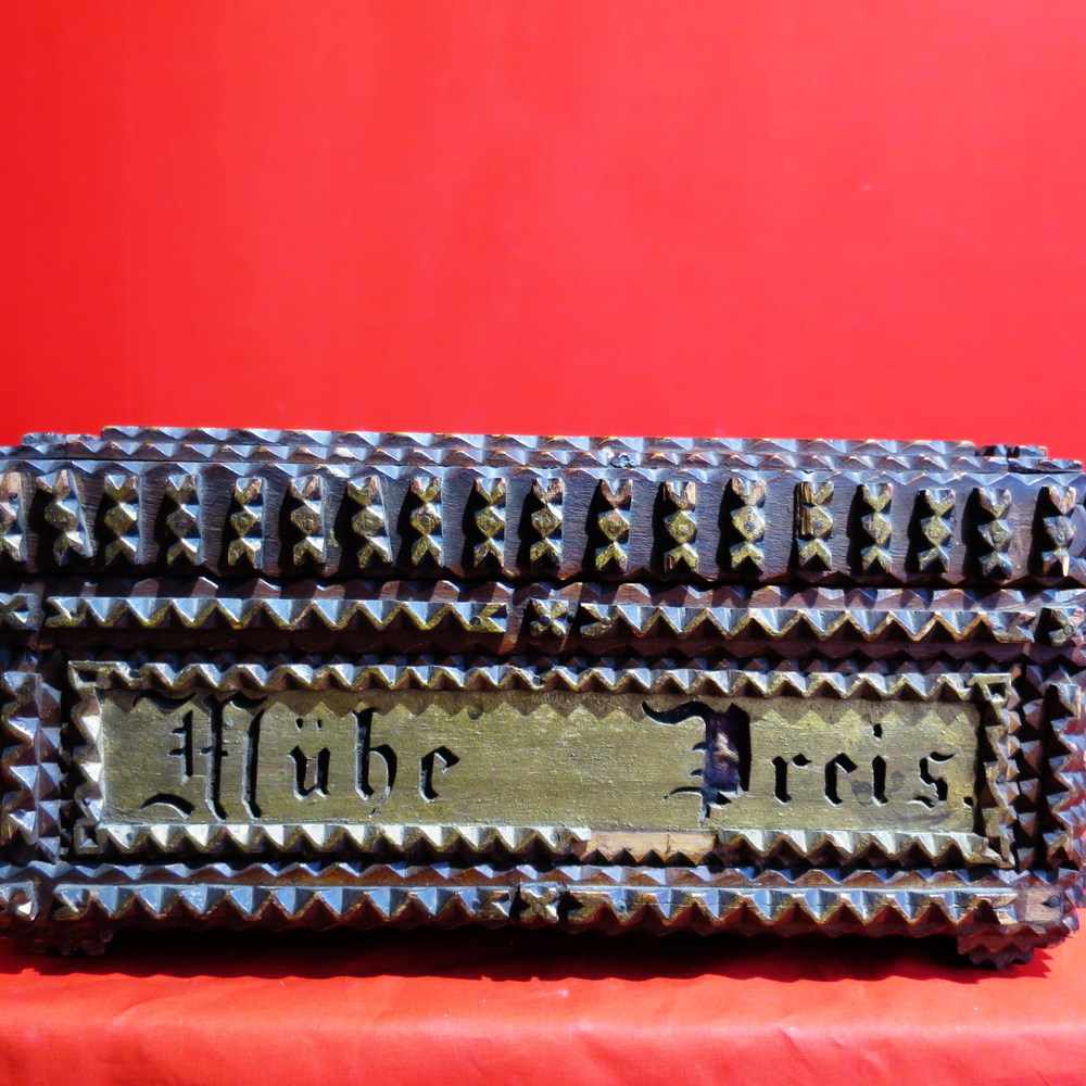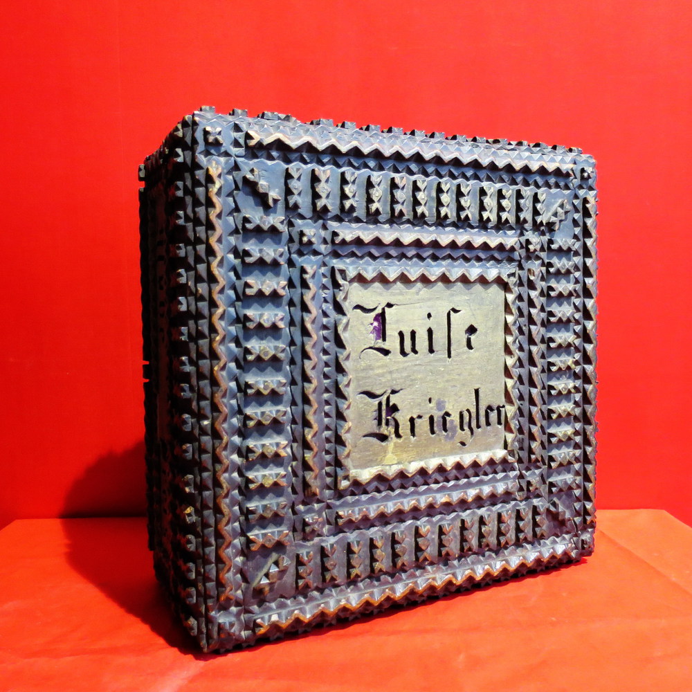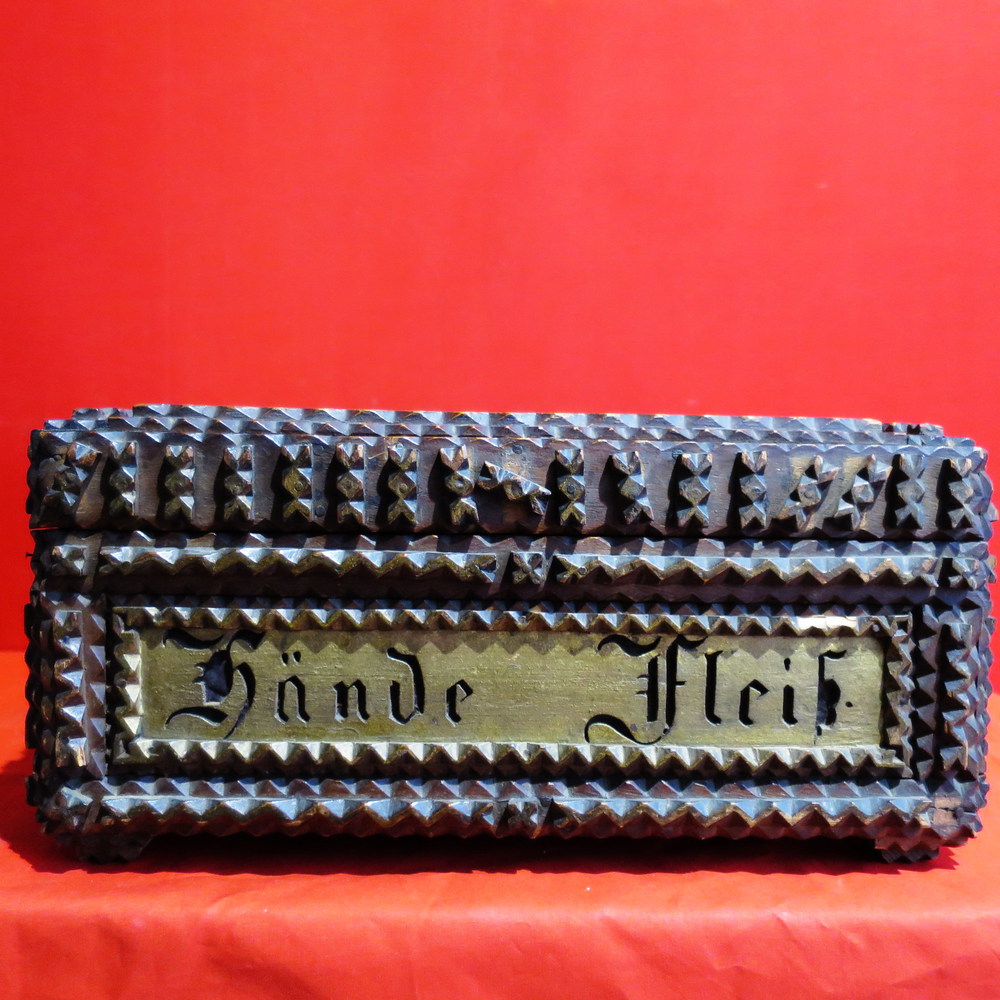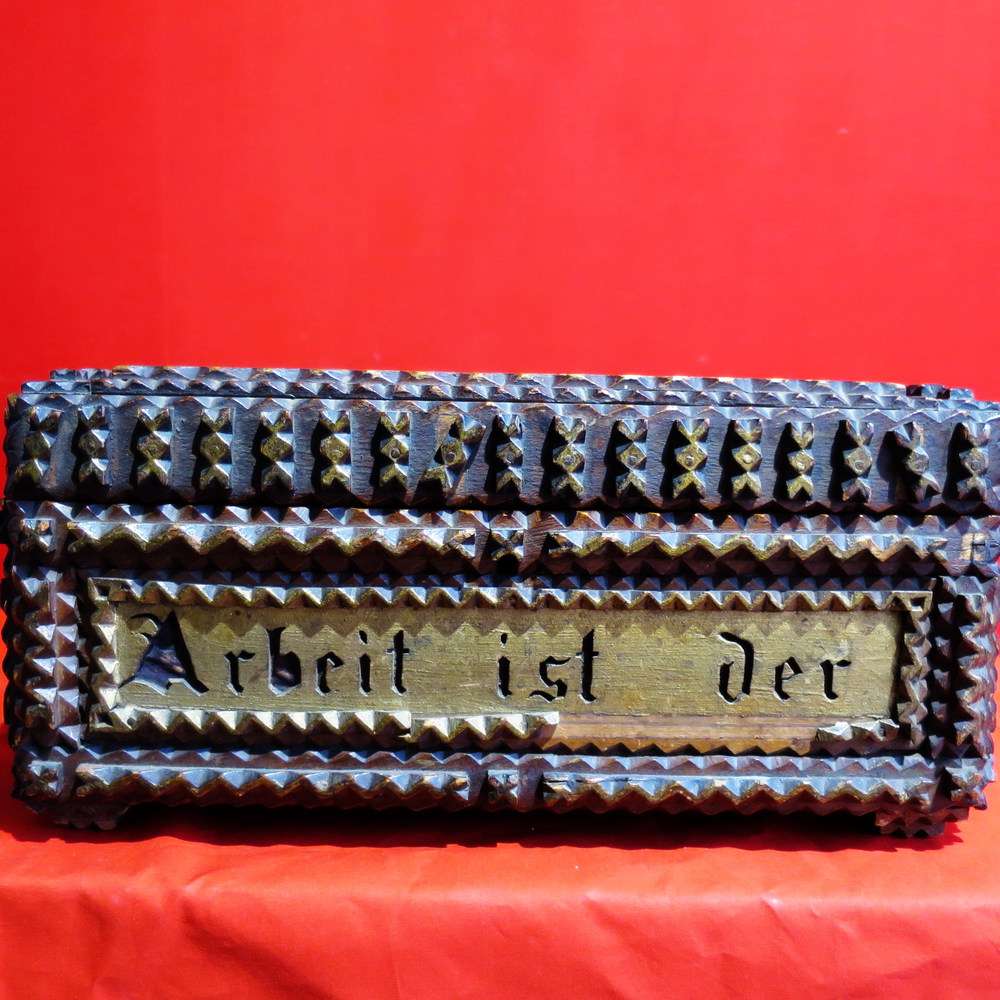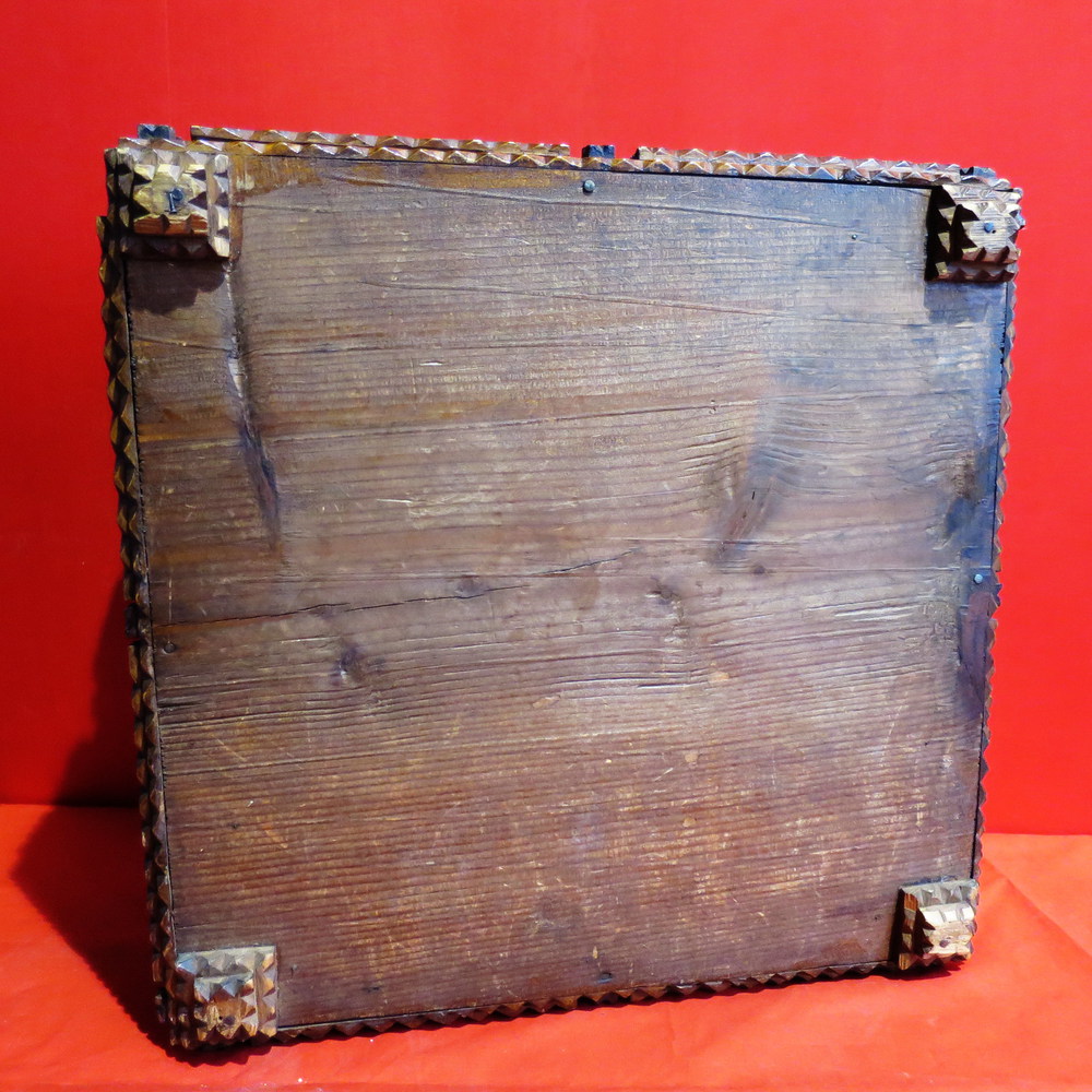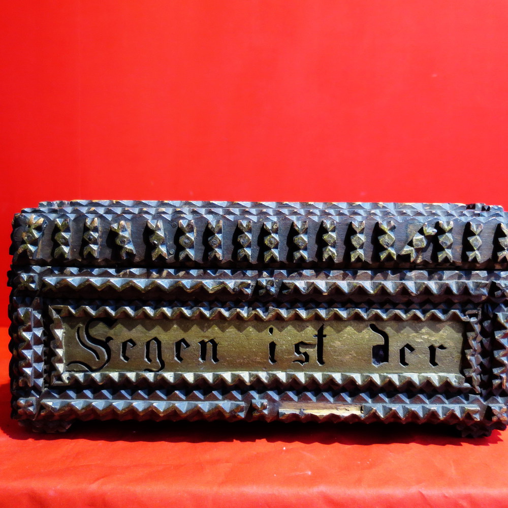 SCATOLA IN LEGNO, GERMANIA, FINE DEL XIX SECOLO In legno intagliato con pannelli traforati, diciture in lingua tedesca, 29 x 13,5(h) x 29 cm A GERMAN CARVED WOOD BOX