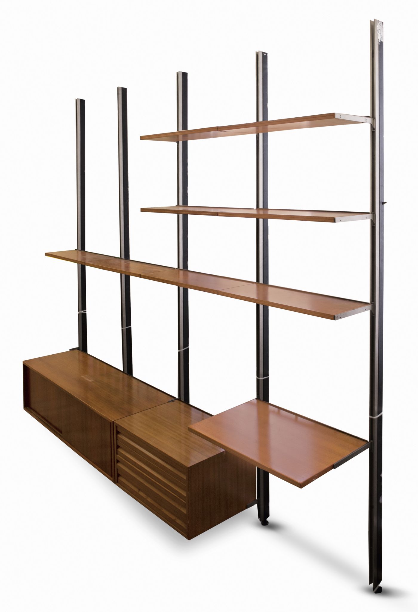 BORSANI OSVALDO E22 Sistema coordinato di elementi componibili in palissandro con guide a parete in alluminio. Prod.Tecno 1951 cm 300x280x54 Bibl.: Giuliana Gramigna, "Repertorio 1950-1980", Mondadori, 1985, pag. 68.