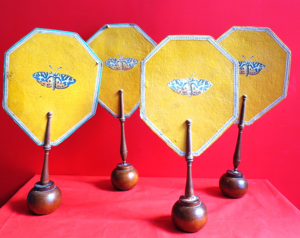4 VENTOLE PARAFUOCO, ITALIA, XIX SECOLO decorate e poggianti su base in legno circolare A SET OF FOUR ITALIAN HAND-HELD FIRESCREENS