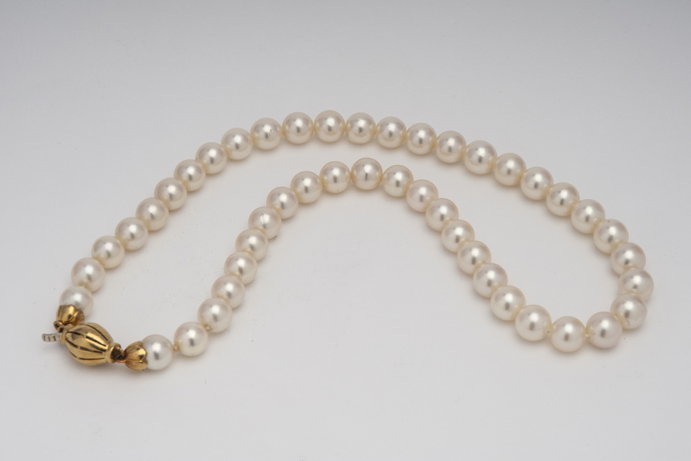 COLLANA IN ORO E PERLE COLTIVATE ad un filo di perle, fermezza in oro giallo A GOLD AND CULTURED PEARL NECKLACE