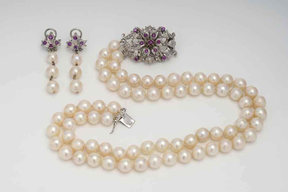 DEMI-PARURE COMPOSTA DA UNA COLLANA E ORECCHINI CON PERLE COLTIVATE, DIAMANTI E RUBINI la collana realizzata con due file di perle coltivate del Giappone di mm 9,5, la chiusura in oro bianco e pendente decorato con rubini e diamanti taglio brillante; gli orecchini pendenti en suite realizzati con perle, diamanti e rubini. Lunghezza della collana cm 33,5 A DOUBLE STRAND SOUTH SEA CULTURED PEARL, DIAMOND AND RUBY PENDANT/BROOCH NECKLACE AND PAIR OF MATCHING PENDENT EARRINGS