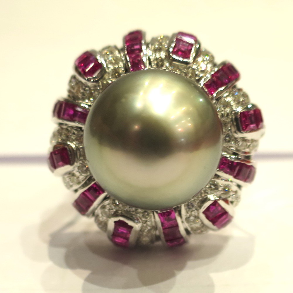 ANELLO IN ORO BIANCO, PERLA, DIAMANTI E RUBINI decorato con perla Tahiti, rubini taglio carré del peso stimato di carati 3, diamanti taglio brillante di carati 1,20 ca, Peso g 24 A WHITE GOLD, DIAMOND, RUBY AND TAHITI CULTURED PEARL RING