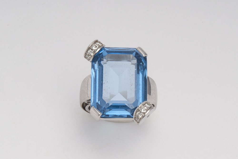 ANELLO IN ORO BIANCO, TOPAZIO E DIAMANTI decorato con topazio taglio ottagonale a gradini, diamanti del peso stimato di carati 20, Peso g 21,2 A WHITE GOLD, BLUE TOPAZ AND DIAMOND RING