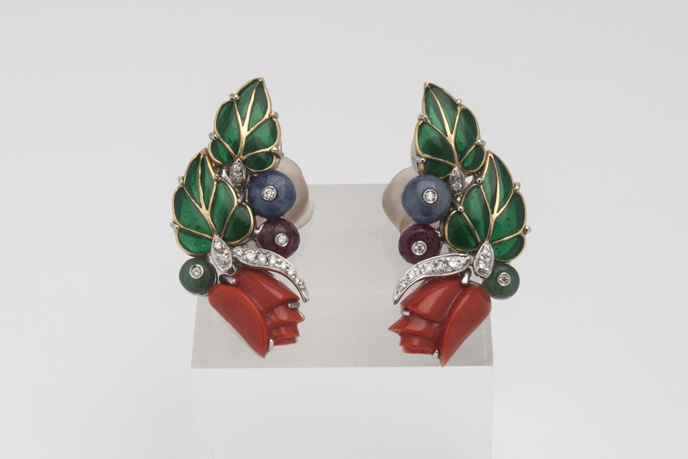 ORECCHINI IN ORO BIANCO, DIAMANTI, RUBINI, ZAFFIRI, SMERALDI, CORALLO E SMALTO decorati a motivi floreali, i rubini del peso stimato di ct 1,80, gli zaffiri di ct 0,72. Raffinata esecuzione dell'orafo italiano Legnazzi, smaltatura a cattedrale, Punzone del fabbricante, Peso g 21,20 (en suite con il lotto precedente) A PAIR OF WHITE GOLD, DIAMOND, RUBY, SAPPHIRE, EMERALD, CORAL AND ENAMEL EARRINGS. BY LEGNAZZI
