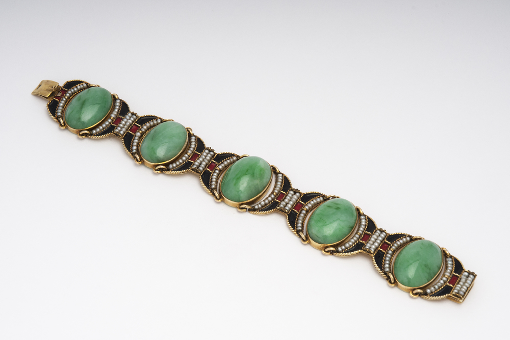 BRACCIALE IN ORO, GIADA, PERLE E SMALTI morbido, formato da sette elementi in...