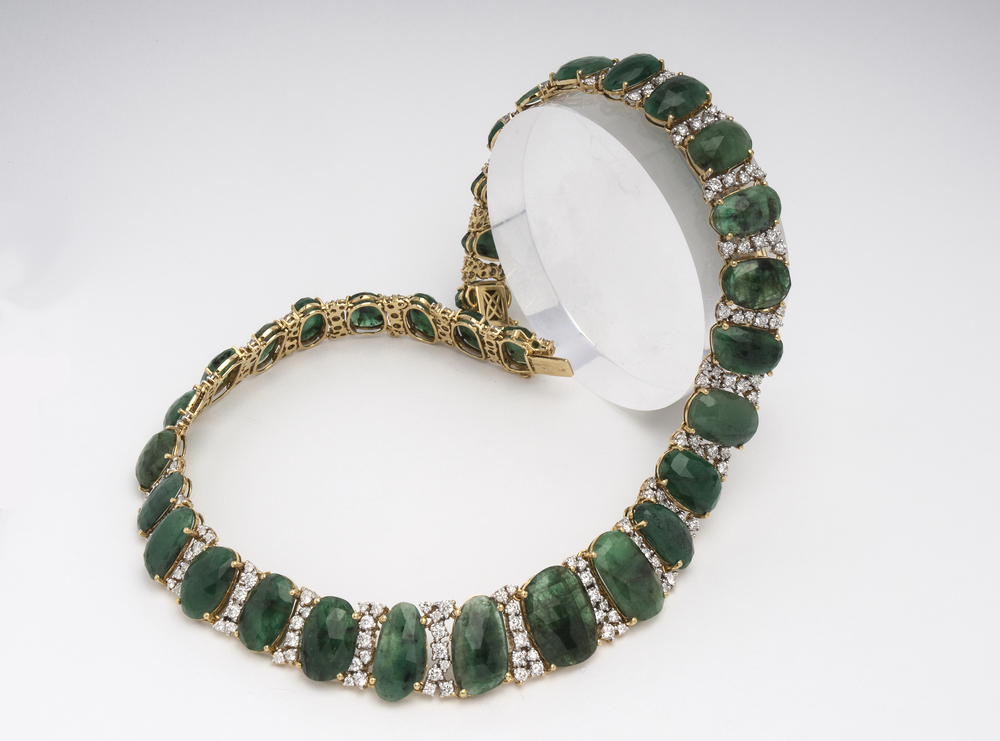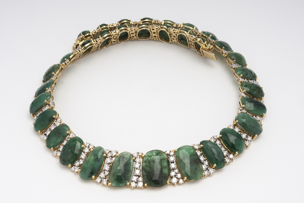 COLLANA IN ORO, SMERALDI E DIAMANTI decorato con smeraldi massivi sfaccettati del peso stimato di carati 141, e con diamanti taglio brillante del peso stimato di carati 12, Peso g 94,20 A GOLD, EMERALD AND DIAMOND COLLAR NECKLACE
