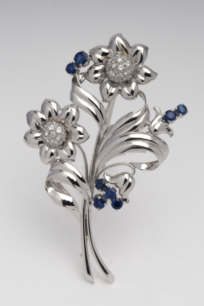 SPILLA IN ORO BIANCO, ZAFFIRI E DIAMANTI a motivo floreale, decorata con 8 zaffiri di ct 1,50 ca, e 40 diamanti taglio brillante di ct 0,50 ca, Peso g 19,20 A WHITE GOLD, SAPPHIRE AND DIAMOND BROOCH