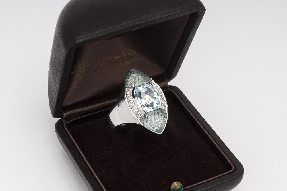 FULVIO MARIA SCAVIA - ANELLO IN ORO BIANCO, DIAMANTI E ACQUAMARINE a forma di navette, decorato con 3 acquamarine di cui 2 a taglio cabochon e 1 sfaccettata e 10 diamanti taglio brillante di carati stimati 0,50 . Punzone dll'oro 750, firmato Fulvio Maria Scavia. (gli unici) Con astuccio originale. Pezzo unico. Peso g 18,20 Misura 16 AN AQUAMARINE, DIAMOND AND 18K WHITE GOLD CLUSTER RING. UNIQUE PIECE BY FULVIO MARIA SCAVIA, MILAN