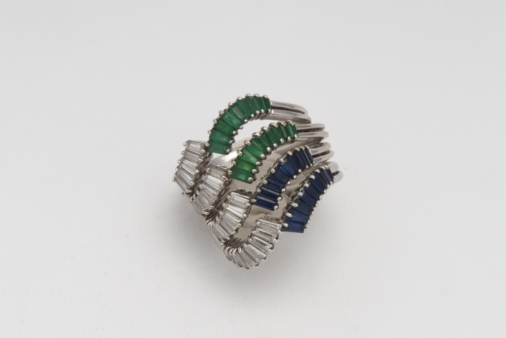 ANELLO AD INCASTRO IN ORO BIANCO E PIETRE PREZIOSE ad incastro, composto da 4 anelli decorati con brillanti, zaffiri, smeraldi, di carati stimati 1,70 A WHITE GOLD AND PRECIOUS STONE FOUR-BAND RING